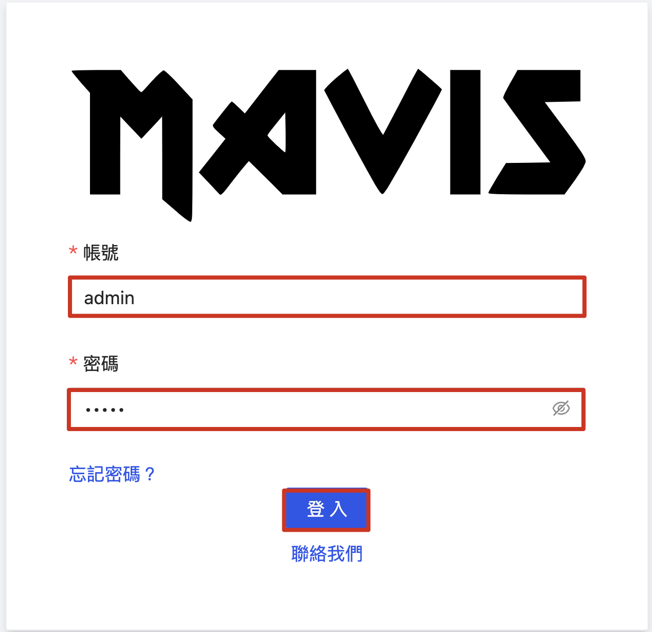 Step 1: Use your browser to connect to the Mavis platform URL, and log in using the default admin account and password (admin).