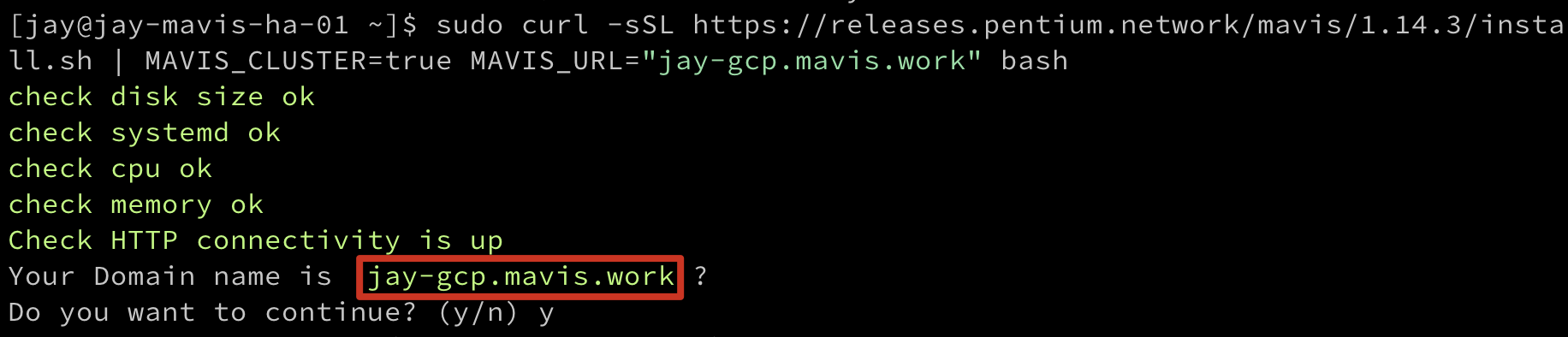 | curl -sSL https://releases.pentium.network/mavis/latest/install.sh | MAVIS_CLUSTER=true MAVIS_URL="your_fqdn_name" bash |