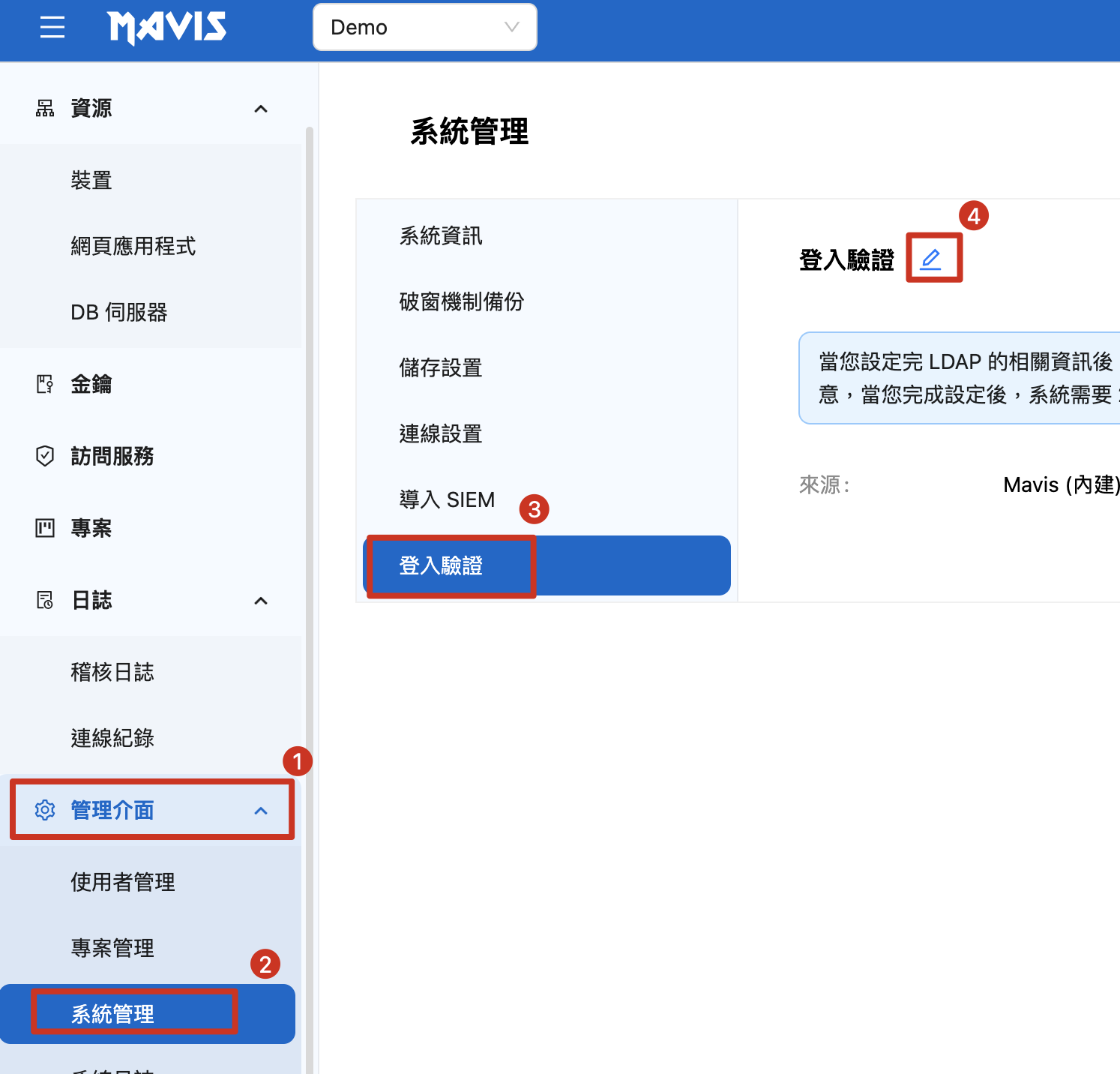| 1. 選擇 管理介面 2. 選擇 系統管理 3. 選擇 登入驗證 4. 選擇 編輯 |