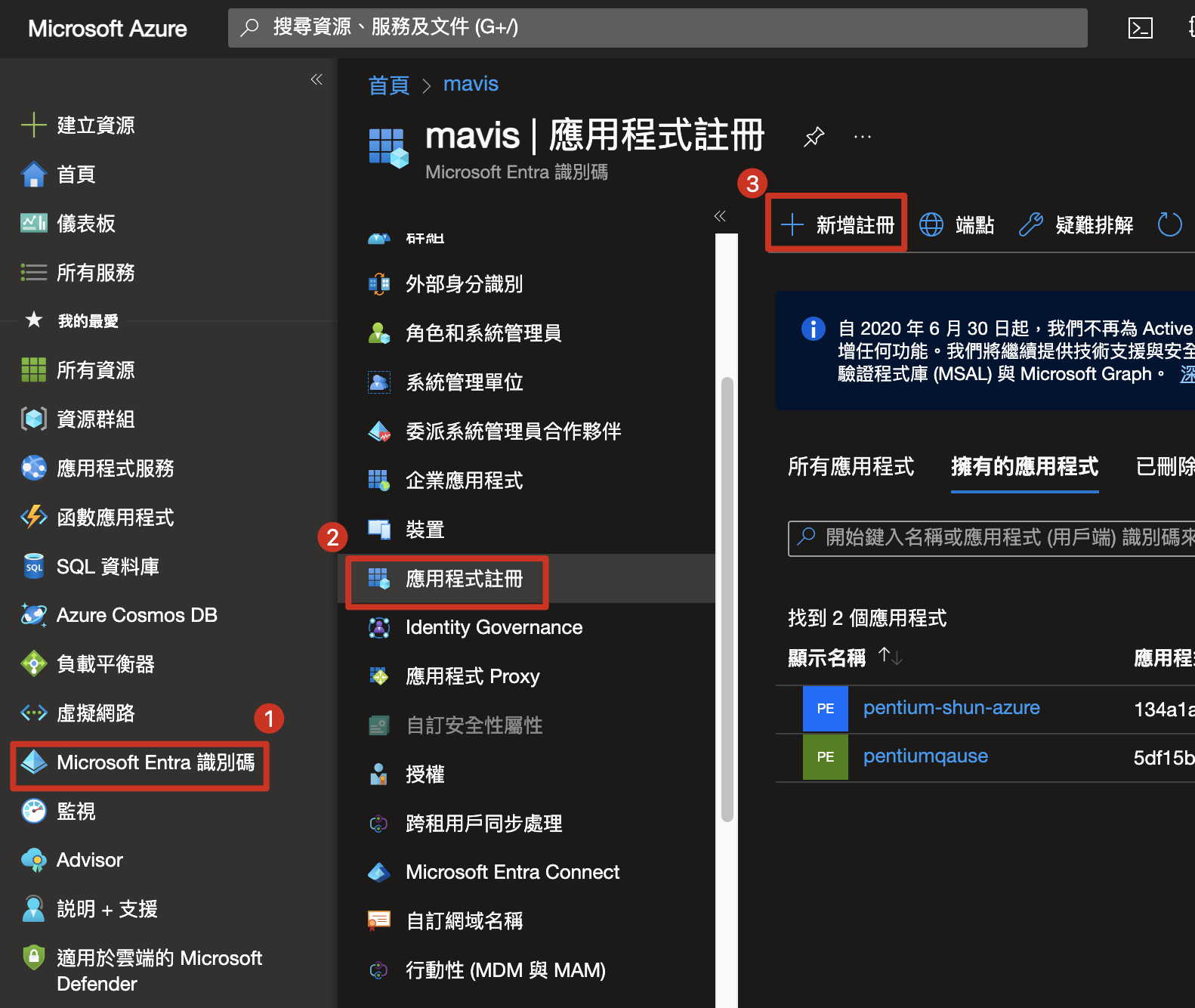 | 登入: https://portal.azure.com/#home 1. 點選 Azure Active Directory 2. 點選 應用程式註冊 3. 點選 新增註冊 |