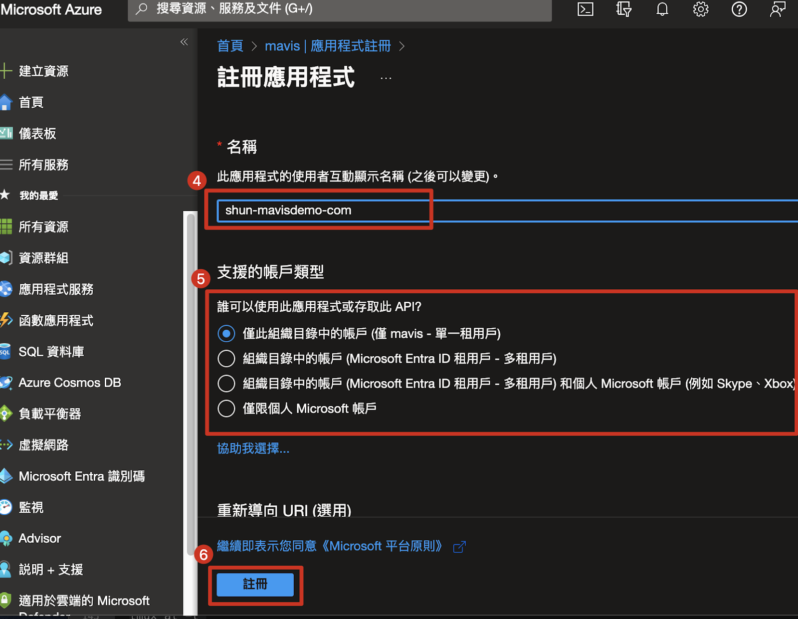 | 4. 輸入 自定義名稱 5. 支援的帳戶類型:勾選公司帳戶類型 此範例勾選:僅此組織目錄中的帳戶 (僅 mavis - 單一租用戶) 6. 點選 “註冊” |