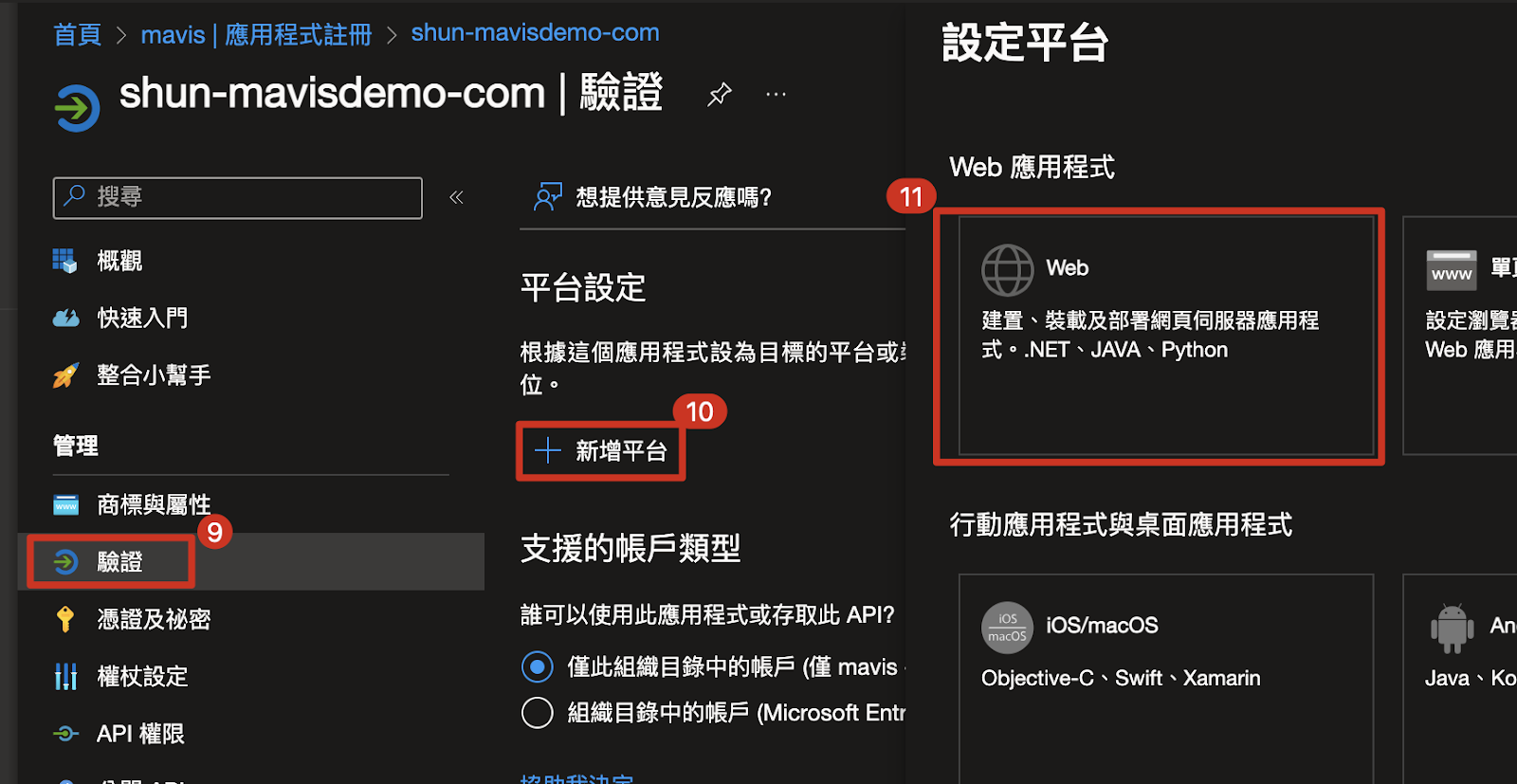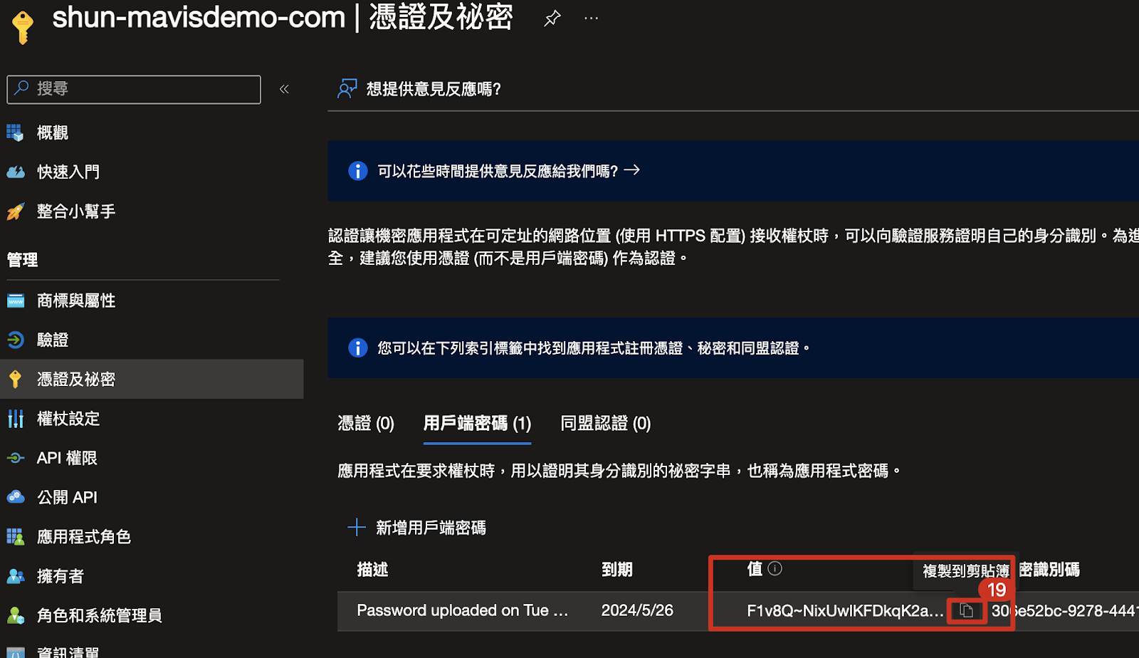 | 12. 重新導向 URI : 輸入自己環境url ⇒ https://mavis url/sso/microsoft 範例:https://shun.mavisdemo.com/sso/microsoft 13. 點選 設定 |