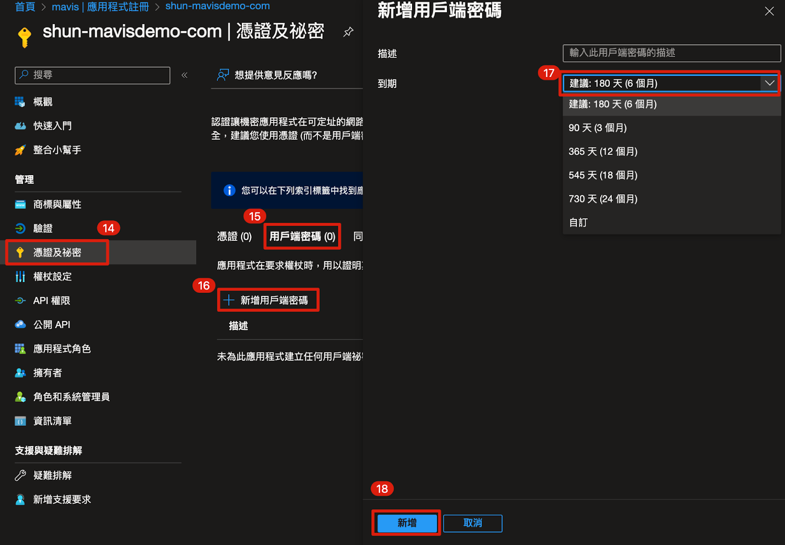 | 創建用戶密鑰, 基於安全考量也請您設定密鑰有效時間 14. 點選 憑證及秘密 15. 選擇 用戶端密碼 16. 點選 新增用戶端密碼 17. 勾選 到期日:自定義到期日 18. 點選 新增 |