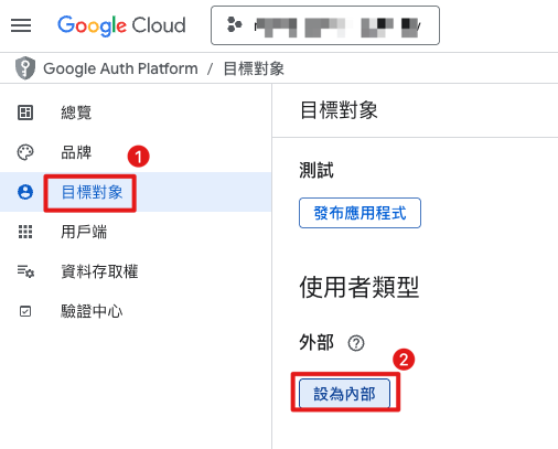 | 於下列網址設定 OAuth consent https://console.cloud.google.com/apis/credentials/consent 1. 選輸「目標對象」 2. 使用者類型 設定內部 PS: 選擇內部 模式下,只有貴機構的 Google Workspace 使用者可以存取您的應用程式 選擇外部 模式下,可同時允許 Organization 內以及一般 gmail 存取您的應用程 |