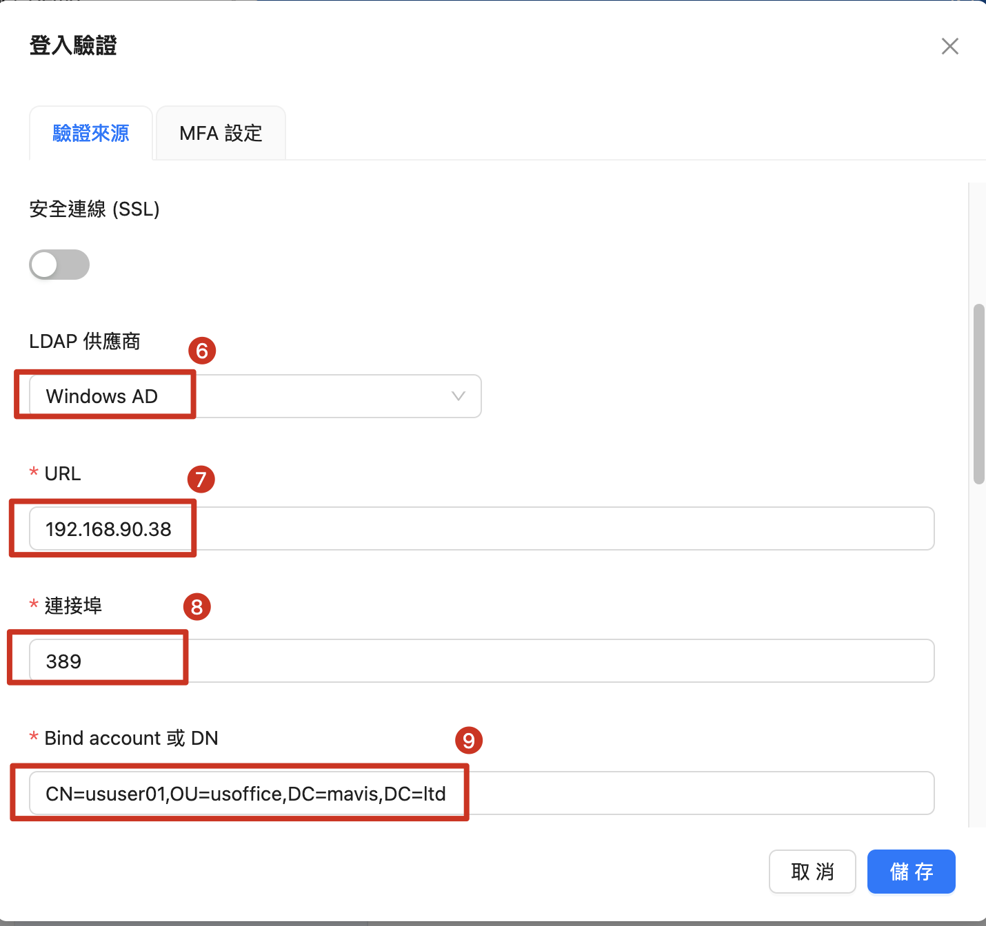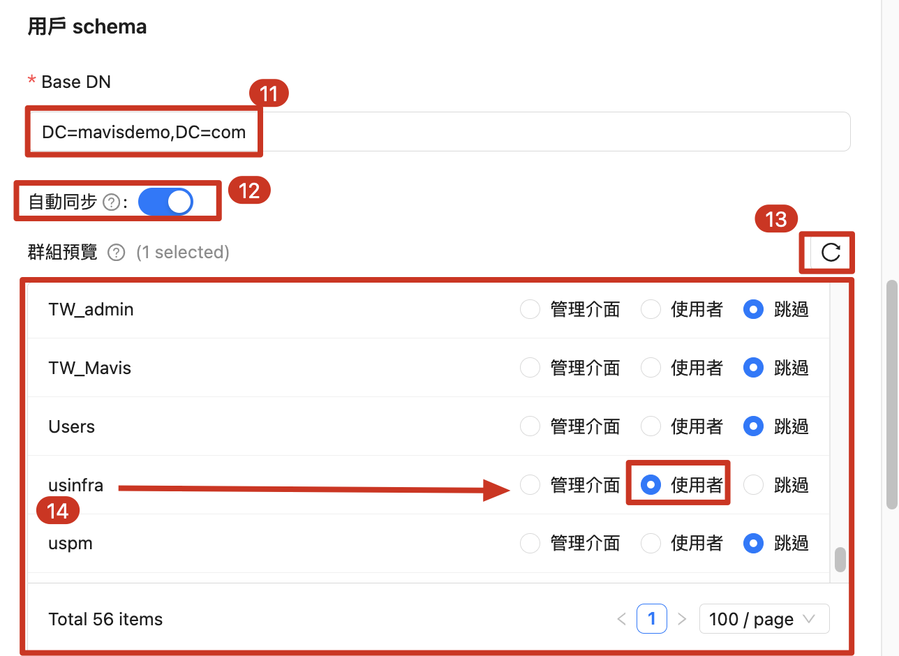 | 6. LDAP供應商:選擇 “Windows AD" 7. URL 輸入:LDAP 伺服器的連線資訊。 8. 連接埠 : 預設連接埠為 389 。 9. Bind account 或 DN: 綁定帳號 。 10. 綁定密碼: Bind password 。 11.Base DN : 域名,例如:DC=mavisdemo,DC=com 。 12.自動同步: 設定啟用後,每兩分鐘會和LDAP Server 同步. 此範例設定啟用。 13.群組預覽:點擊『重新預覽』後,將顯示 Base DN 下的所有群組列表。 14.選擇要導入用戶的群組,並設定導入用戶的相關選項。 管理者介面:將導入的用戶設為管理員。 使用者:將導入的用戶設為一般用戶。 跳過:不導入 備註:”自定義篩選條件“ 可自行設定篩選規則,此範例暫時不設定。 15.預覽同步結果:執行測試以預覽同步結果。 16.使用者預覽: 顯示根據設定篩選出的用戶列表。 17.儲存 |