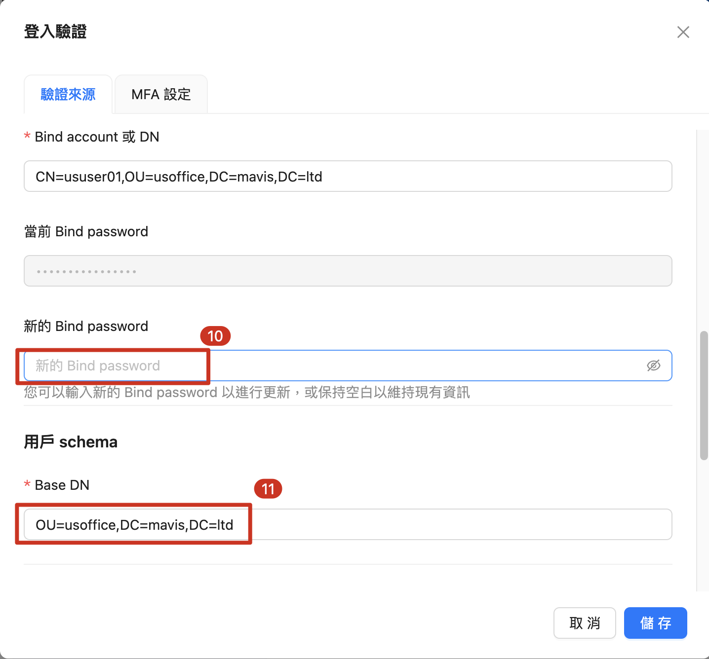 | Bind Account / DN | Provide an LDAP account with admin privileges for searching user info. Examples: cn=Administrator,cn=Users,dc=mavisdemo,dc=com or Administrator@mavisdemo.com