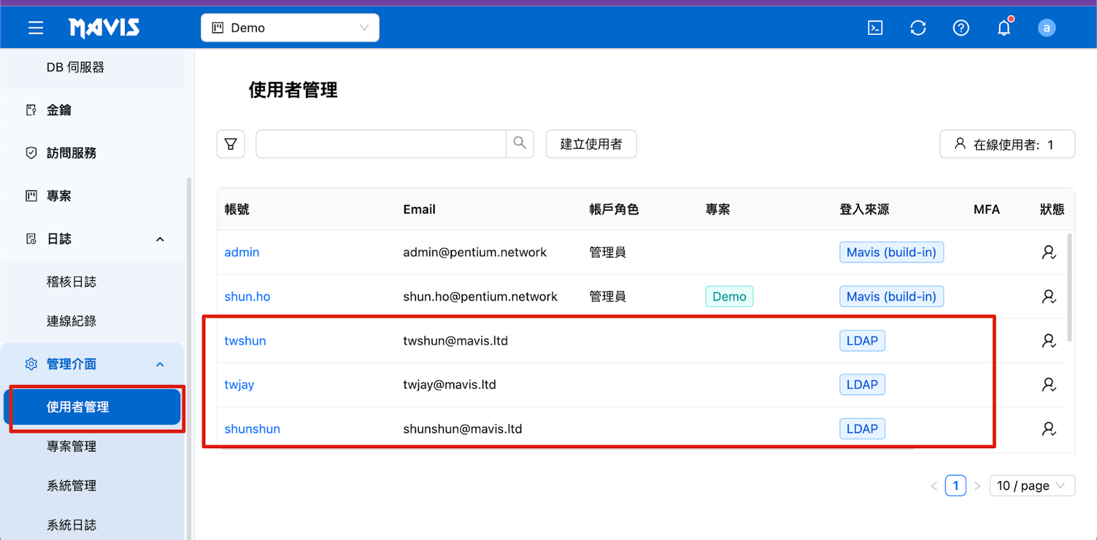 | 指定LDAP server路徑下的使用者帳號已經同步回Mavis |