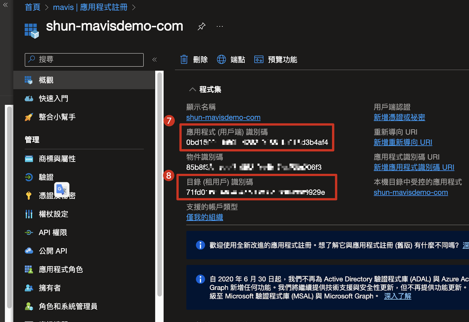 | 7. 應用程式 (用戶端) 識別碼:(client) ID 8. 目錄 (租用戶) 識別碼: Directory (tenant) ID |
