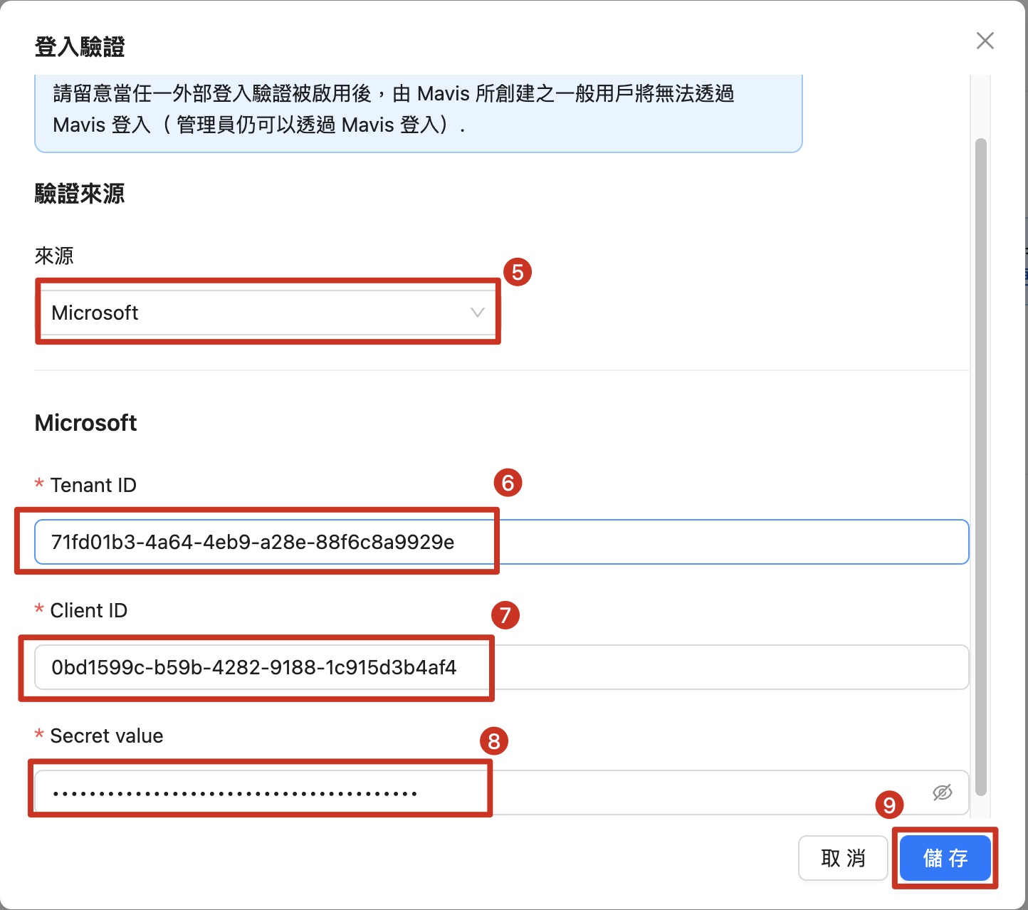 | 5. 來源:選擇 Microsoft 6. 輸入 Tenant ID 7. 輸入 Client ID 8. 輸入 Secret value 9. 點選 儲存 |