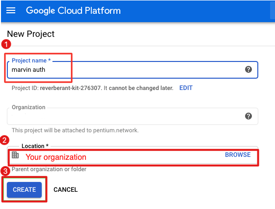 | 於下列網址建立新 project,輸入您的專案名稱 https://console.cloud.google.com/projectcreate 1. 選輸入專案名稱 2. 選擇 您的組織 3. 點選「CREARE」,建立新 project |