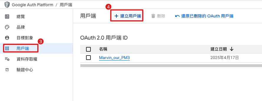 | 3. 點選 用戶端 4. 點選 建立用戶端 |