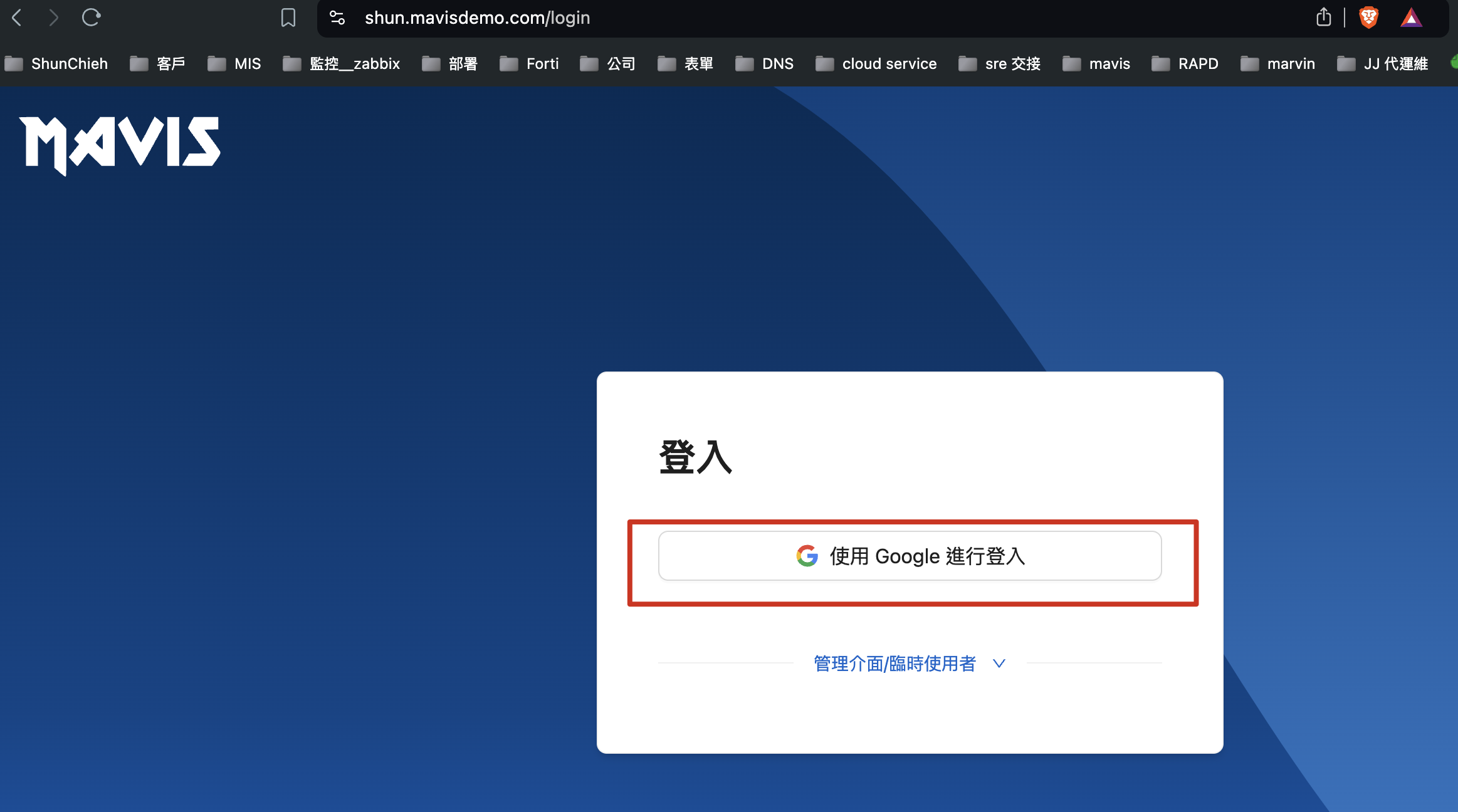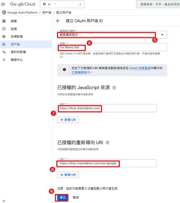| 5. 選擇 網頁應用程式 6. 輸入 自定義名稱 7. 已授權的 JavaScript 來源入: 輸入Mavis url (此範例:https://shun.mavisdemo.com) 8. 已授權的重新導向 URI:輸入 https://{Mavis url}/sso/google 此範例:https://shun.mavisdemo.com/sso/google 9. 點選 建立 |