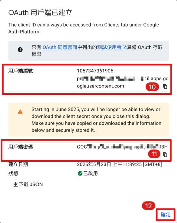 | 10. Client ID 複製並保存 11. Client Secret 複製並保存 12. 點選 確定 |