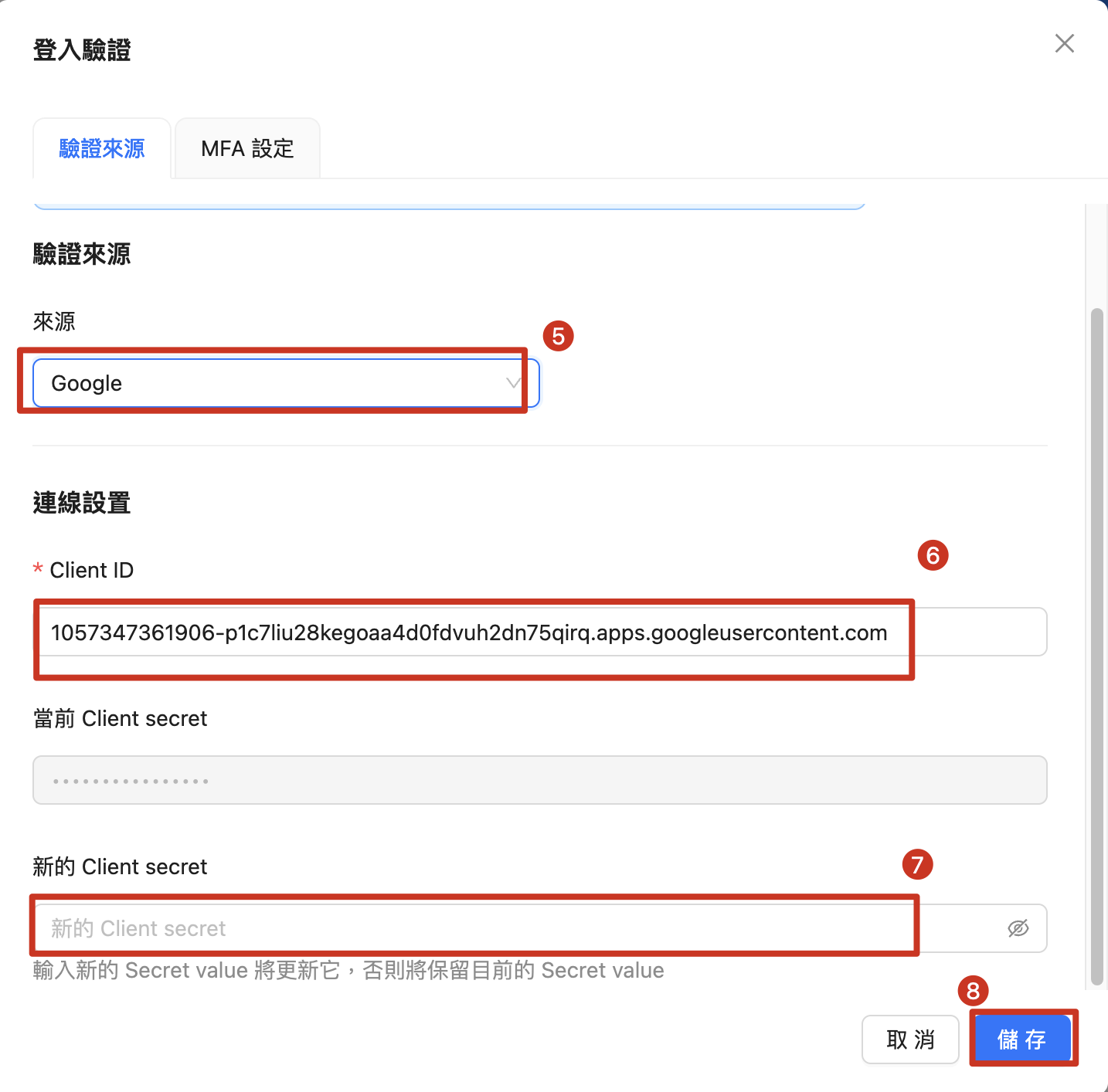 | 5. 來源選擇 Google 6. 輸入 Client ID 7. 輸入 Client secret 8. 點選 儲存 |