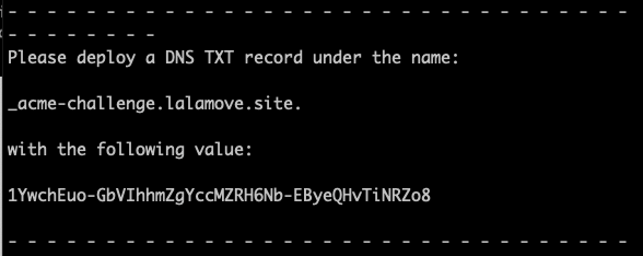 5. The following example demonstrates certificate application using the domain lalamove.site. Please ensure that you own the domain name. Enter the following command to apply for a certificate using DNS validation and request a wildcard domain certificate.