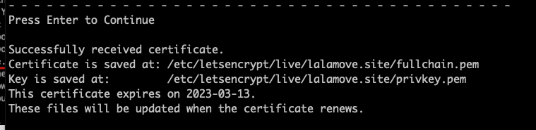 9. Once the resolution is effective, return to the terminal and press "Enter." Upon successful verification, the system will prompt the path where the certificate and key are placed. The certificate is valid for 90 days.