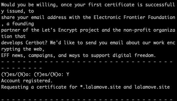 | certbot certonly --manual --agree-tos \ -d "*.lalamove.site" \ -d "lalamove.site" \ --email noc@example.com \ --preferred-challenges dns \ --manual-public-ip-logging-ok \ --server https://acme-v02.api.letsencrypt.org/directory |
