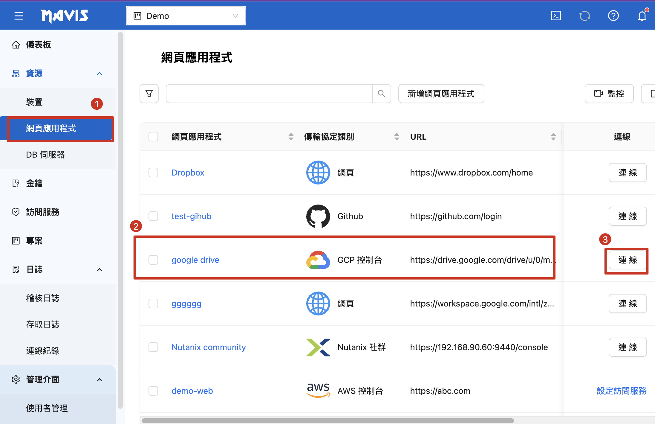 | Click on Web Application (this example uses Google Drive). Select the web application to connect to. Click Connect. |