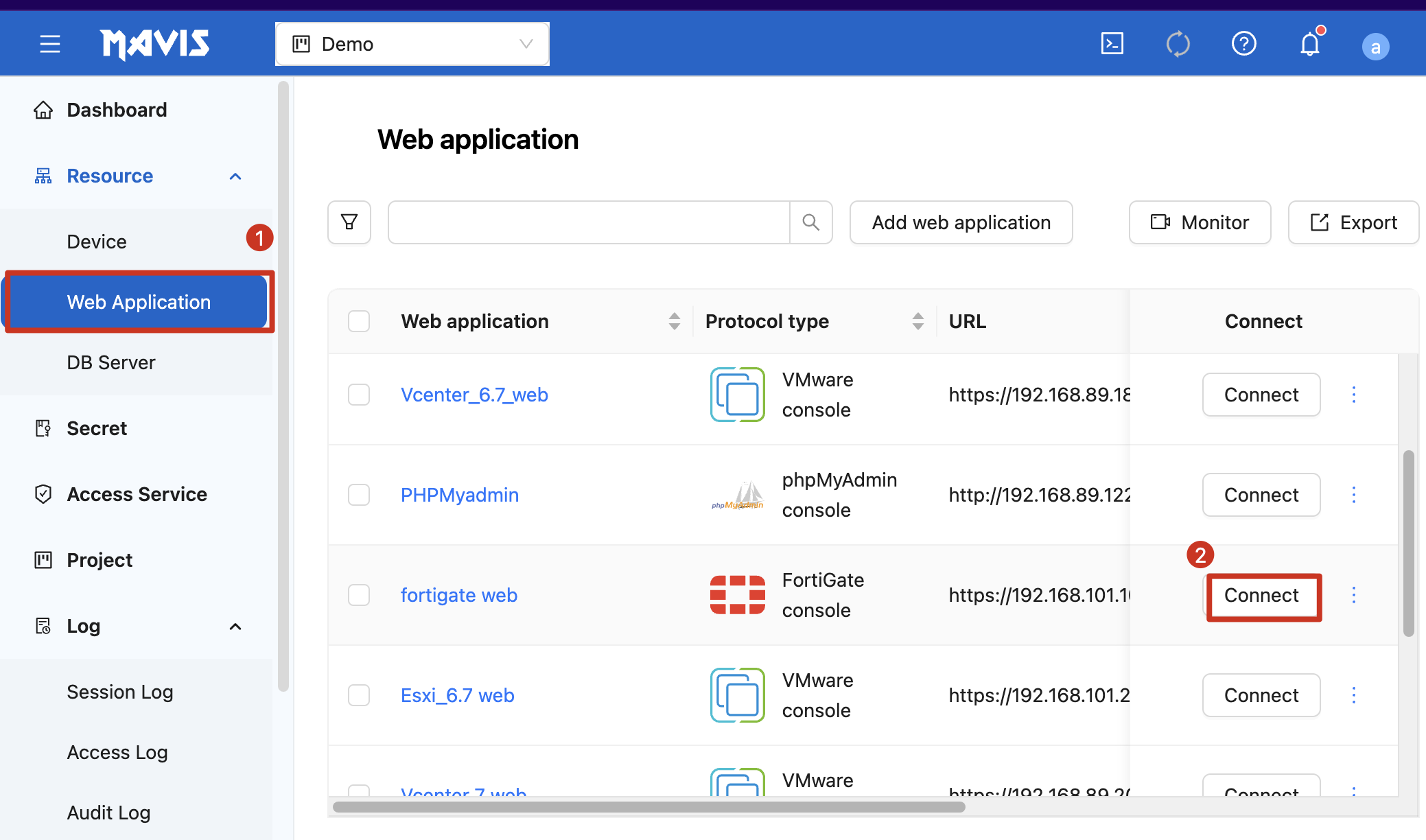 | 1. Click on the web application (in this example, FortiGate). 2. Click on the web application you want to connect to. |