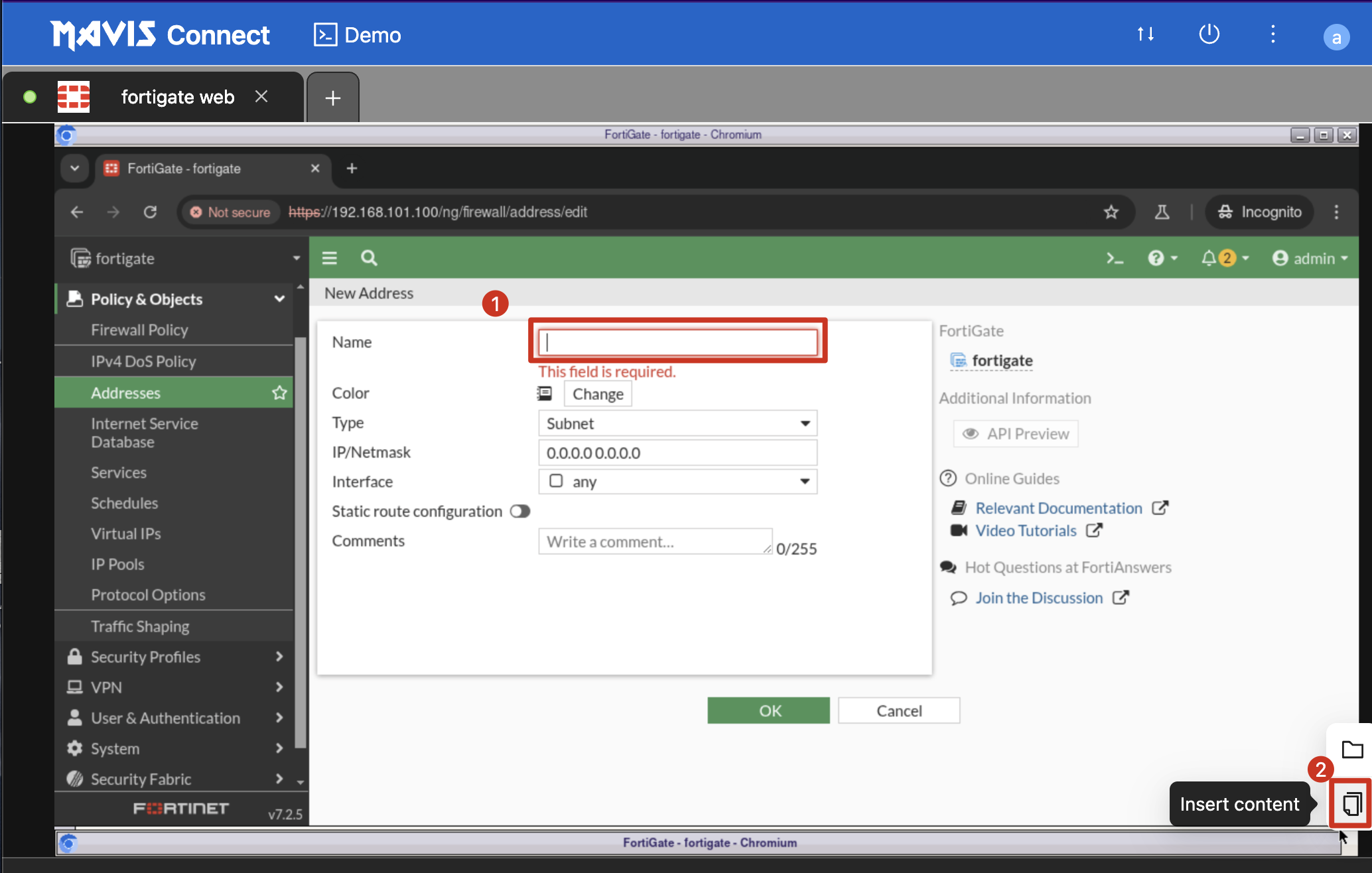 | 1. Place the cursor at the location where you want to enter content. 2. Click the Insert Content icon. |
