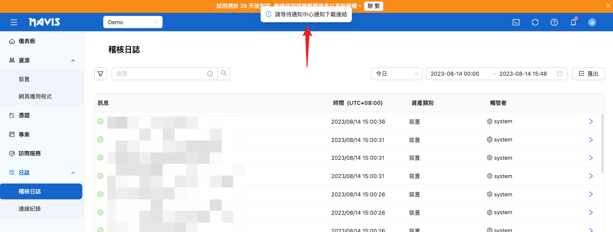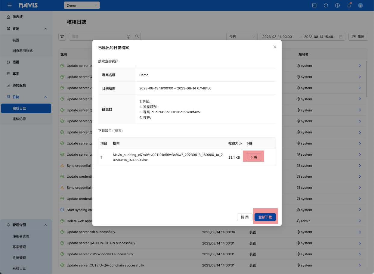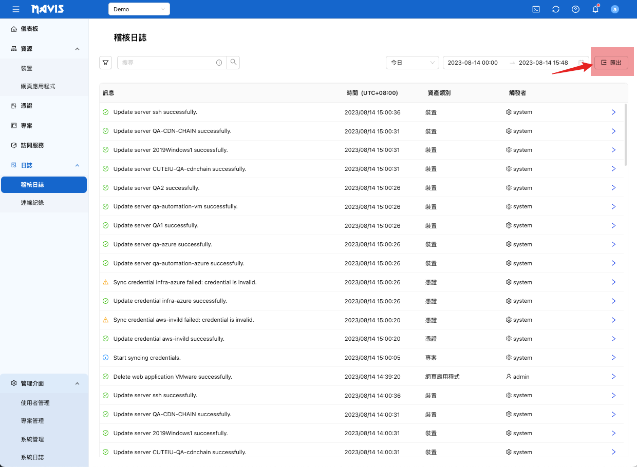 Mavisのログファイルは、Audit log(監査ログ)とSystem log(システムログ)に分類されます。これらのログには、ユーザーアクティビティの詳細な記録が含まれています。例えば、ログインとログアウトの記録があり、ユーザーがシステムやアプリケーションにログインおよびログアウトした時間とIPアドレスが記録されます。