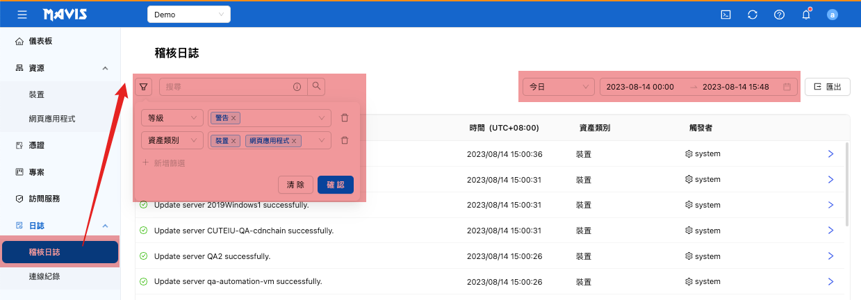 - 監査ログを開き、エクスポートしたいログの範囲をフィルタリングします