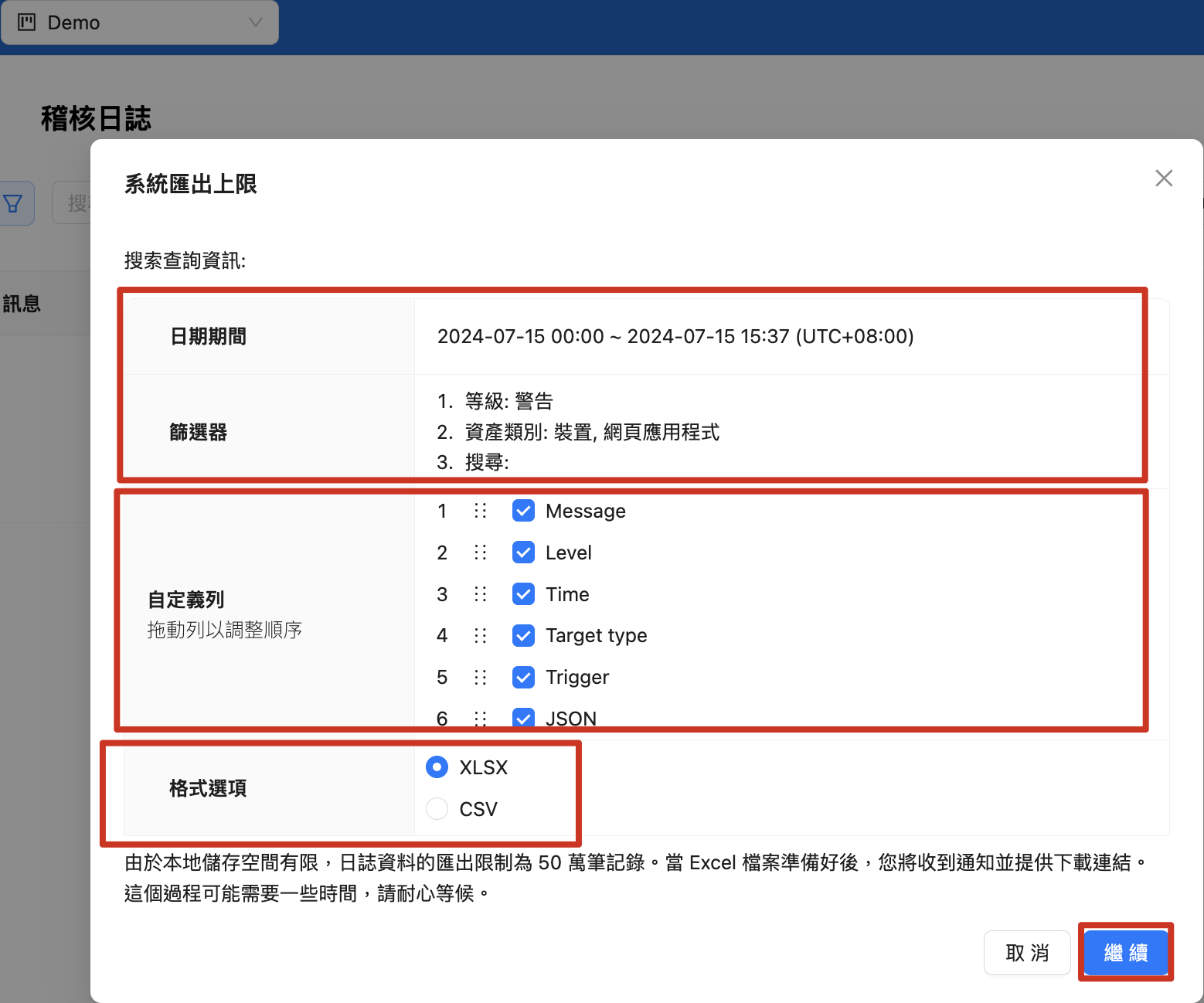 - クエリした期間と関連情報を確認します。確認後、ドラッグアンドドロップとチェックボックスを使用して、フィールド情報と順序をカスタマイズし、適切なフォーマットオプションを選択してから、「続行」をクリックします。