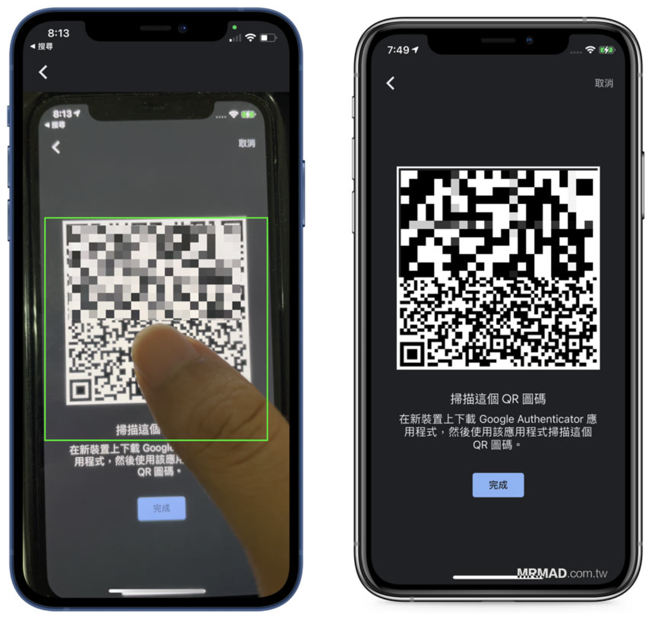 | 6. スマートフォンの Google Authenticator または他の認証アプリで QR コードをスキャンする 7. 「次へ」をクリックする |