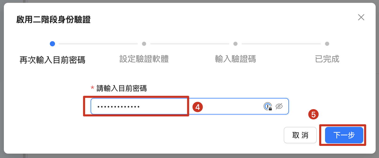 | 4. 現在のパスワードを入力する 5. 「次へ」をクリックする |