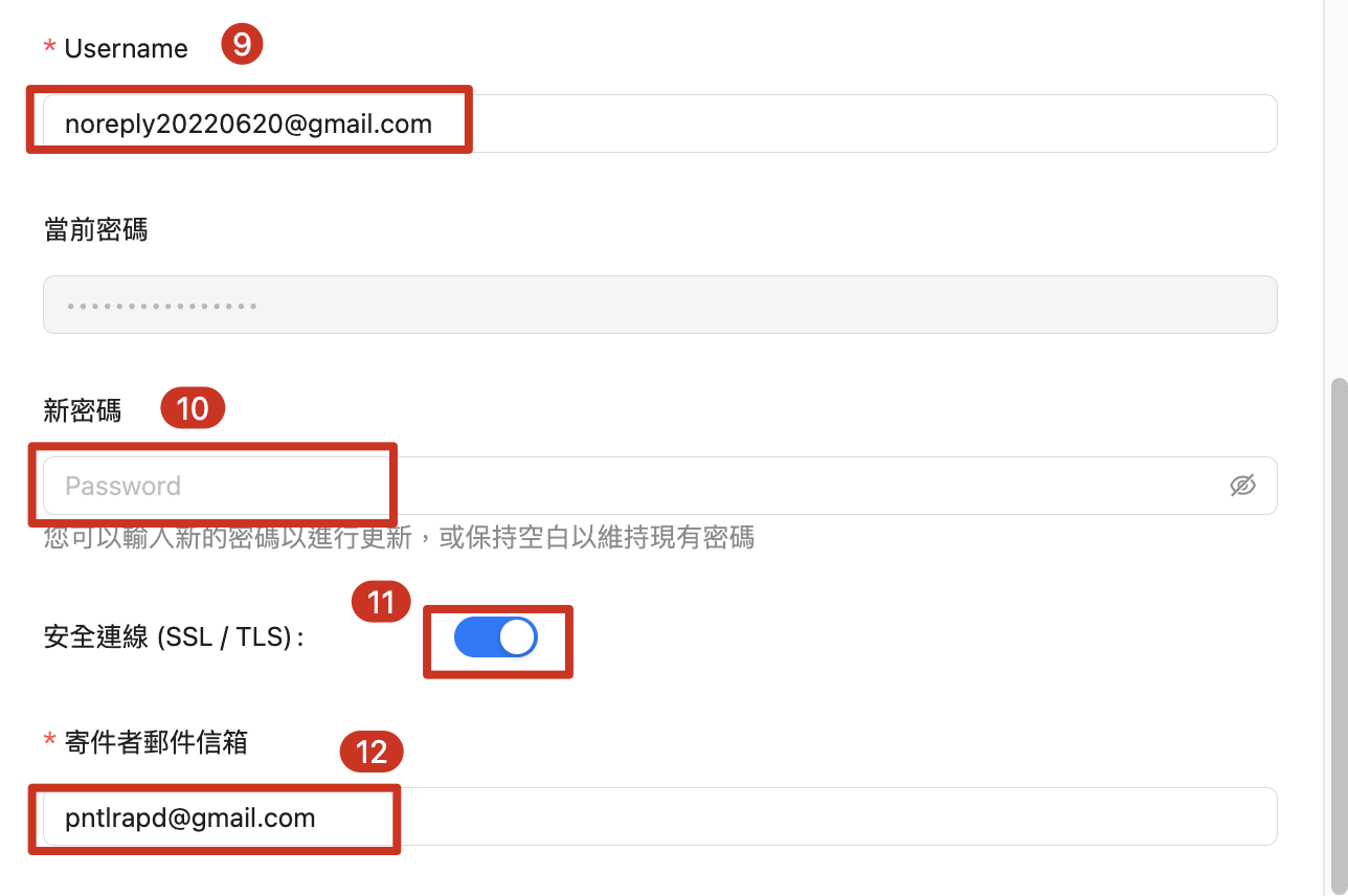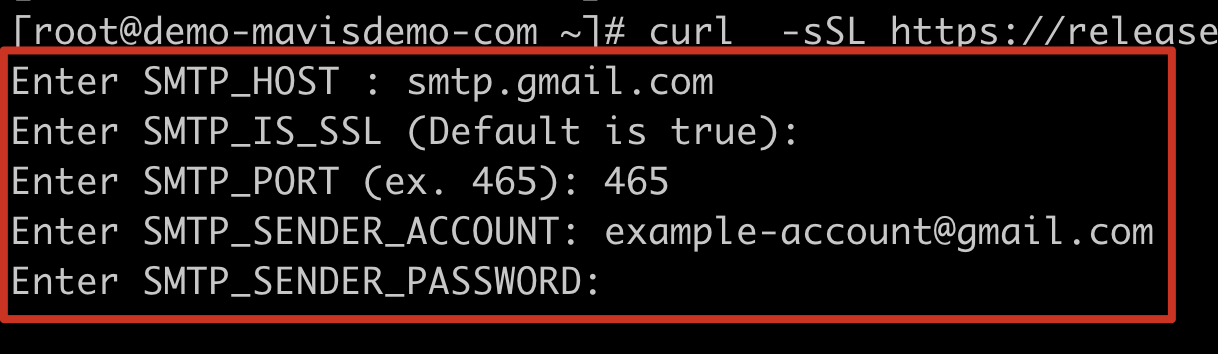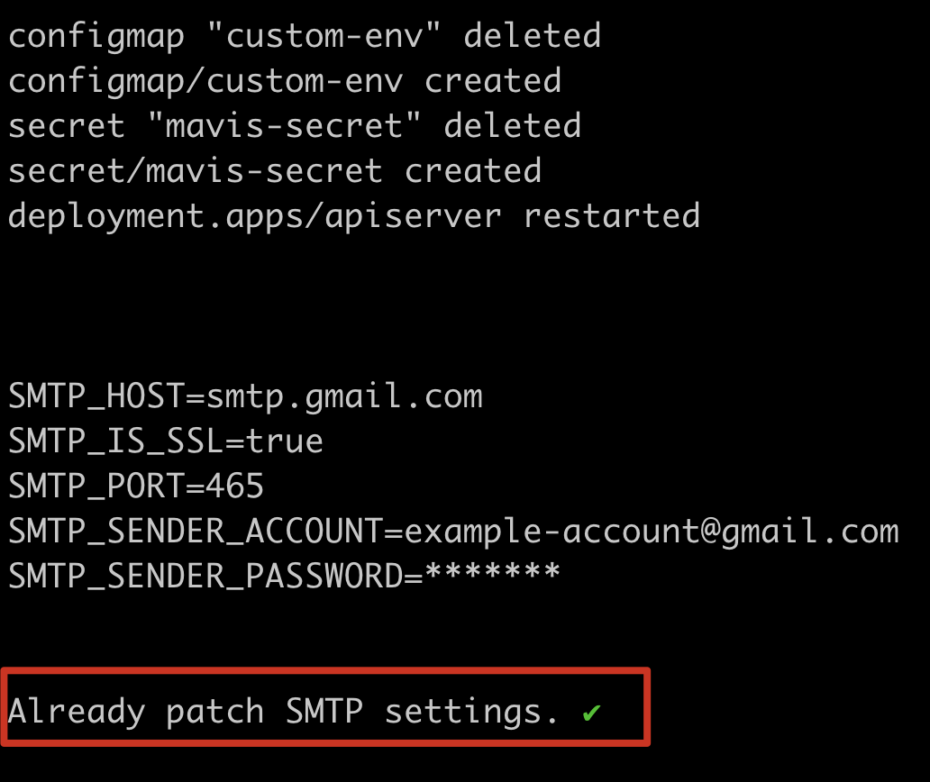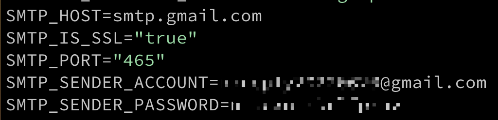 | Enter SMTP_HOST=smtp.gmail.com Enter SMTP_IS_SSL="true" Enter SMTP_PORT="465" Enter SMTP_SENDER_ACCOUNT=example-account@gmail.com Enter SMTP_SENDER_PASSWORD=example-password |