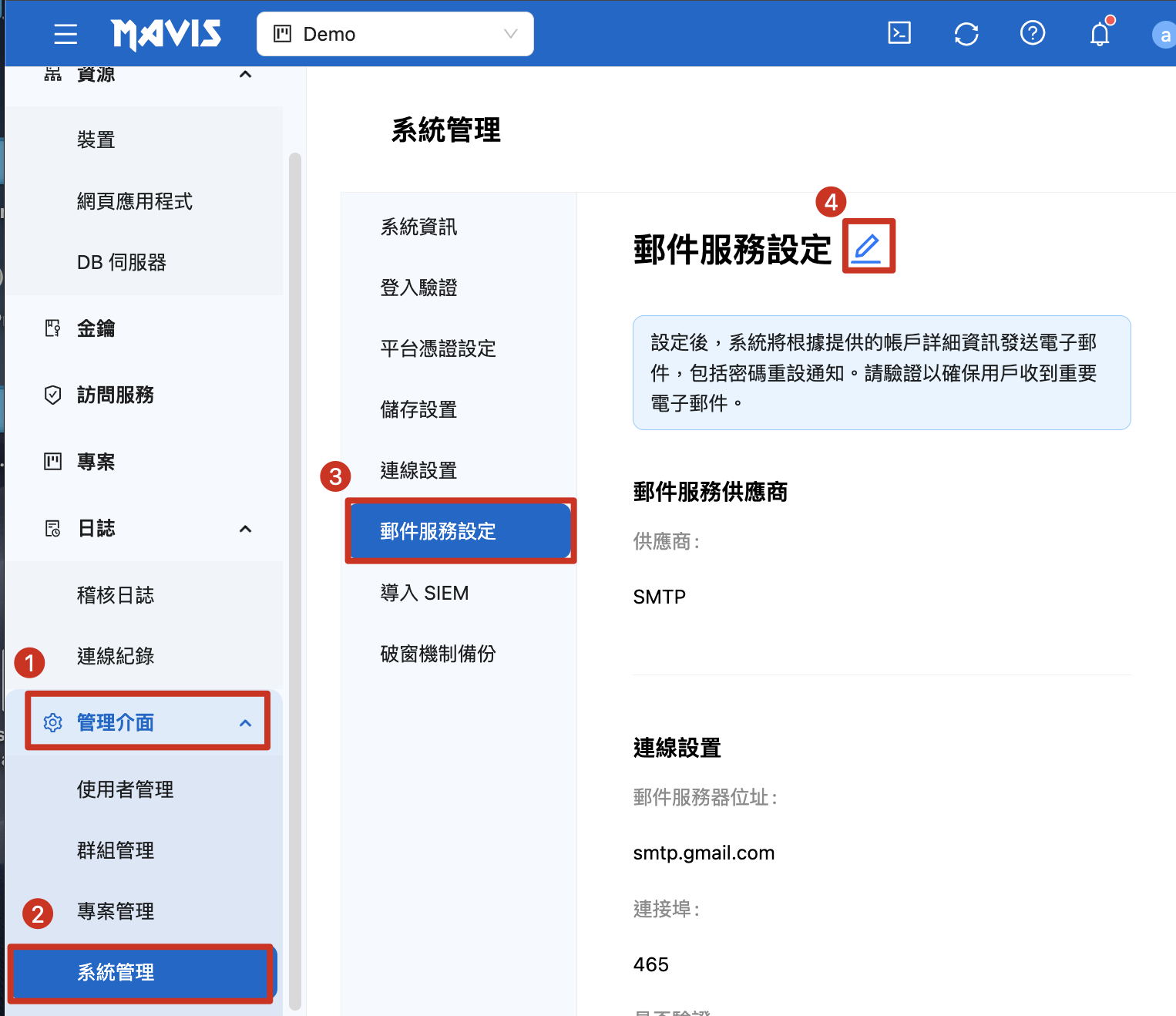 1. 管理インターフェースに進む 2. システム管理をクリック 3. メールサービス設定をクリック 4. 編集アイコンをクリック |