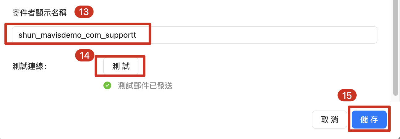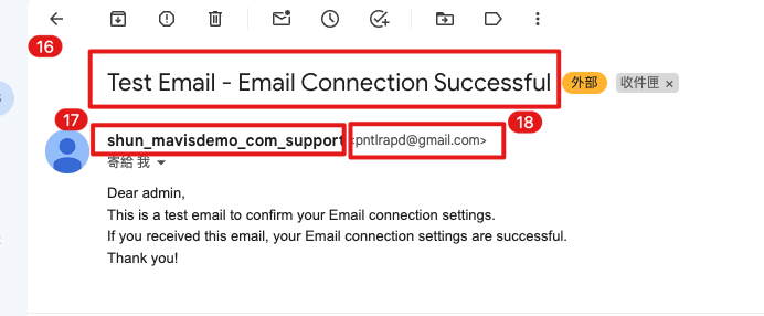 16. Mavis で操作したユーザーアカウントのメールボックスでテストメールを受信 17. ステップ 13 で設定した送信者メールアドレスが表示される 18. ステップ 12 で設定した送信者表示名が表示される |
