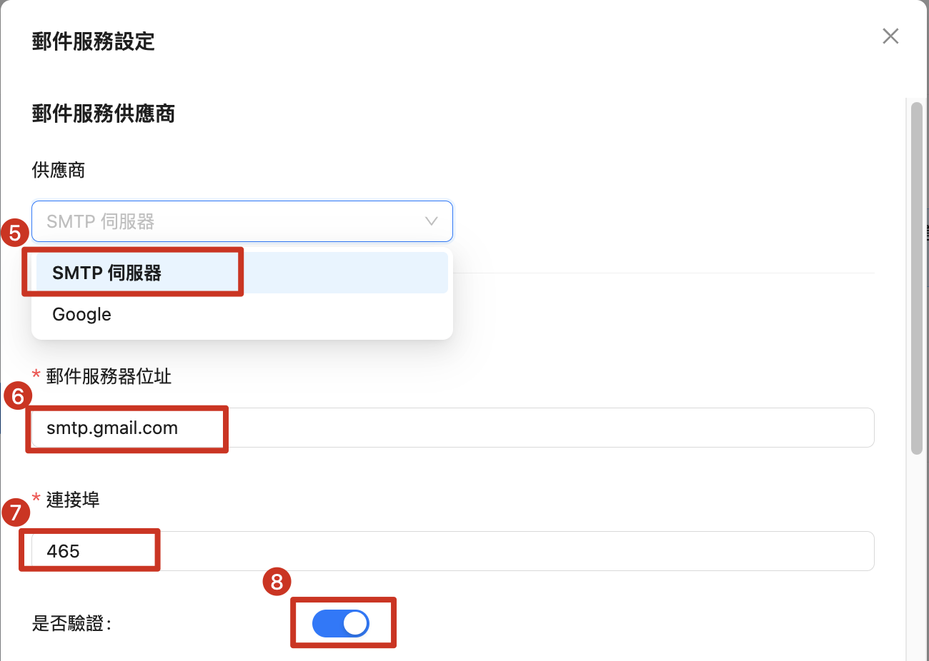 5. プロバイダー:SMTP サーバーにチェック(PS:Gmail アカウントでの送信もサポート) |