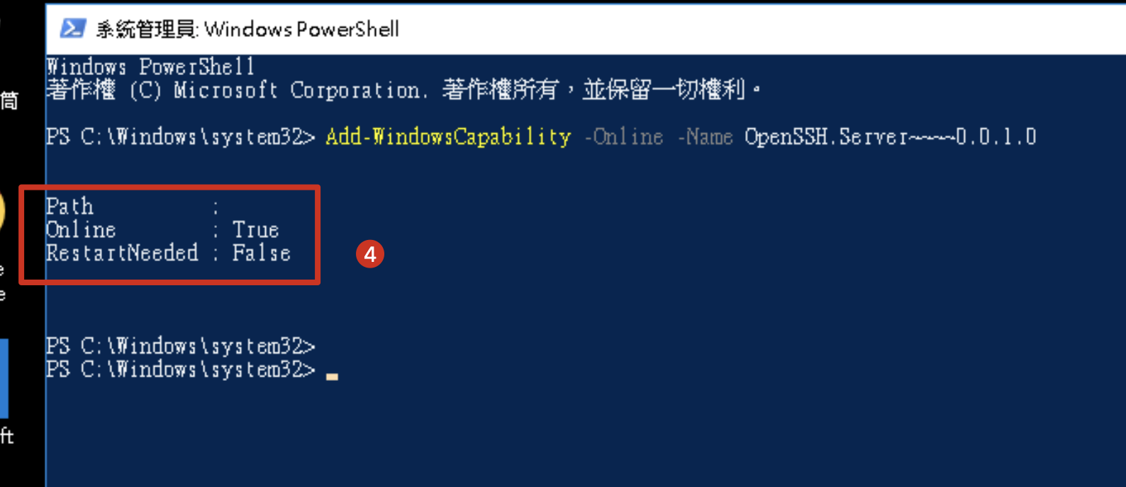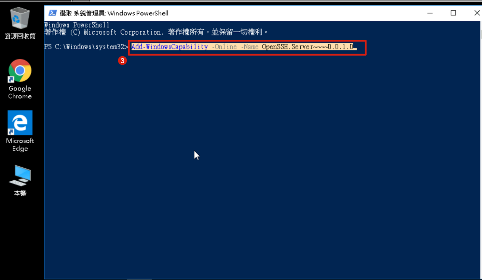 3. OpenSSH Serverをインストールします。以下のコマンドを入力します: Add-WindowsCapability -Online -Name OpenSSH.Server~~~~0.0.1.0 |