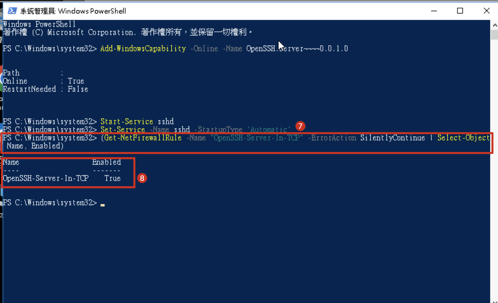 7. ファイアウォールルールが設定されていることを確認します。インストールプログラムによって自動的に作成されているはずです。以下のコマンドを実行して検証します。 (Get-NetFirewallRule -Name "OpenSSH-Server-In-TCP" -ErrorAction SilentlyContinue | Select-Object Name, Enabled) 8. OpenSSH-Server-In-TCPファイアウォールルールが設定されていることを示します(22番ポートを許可)。 |