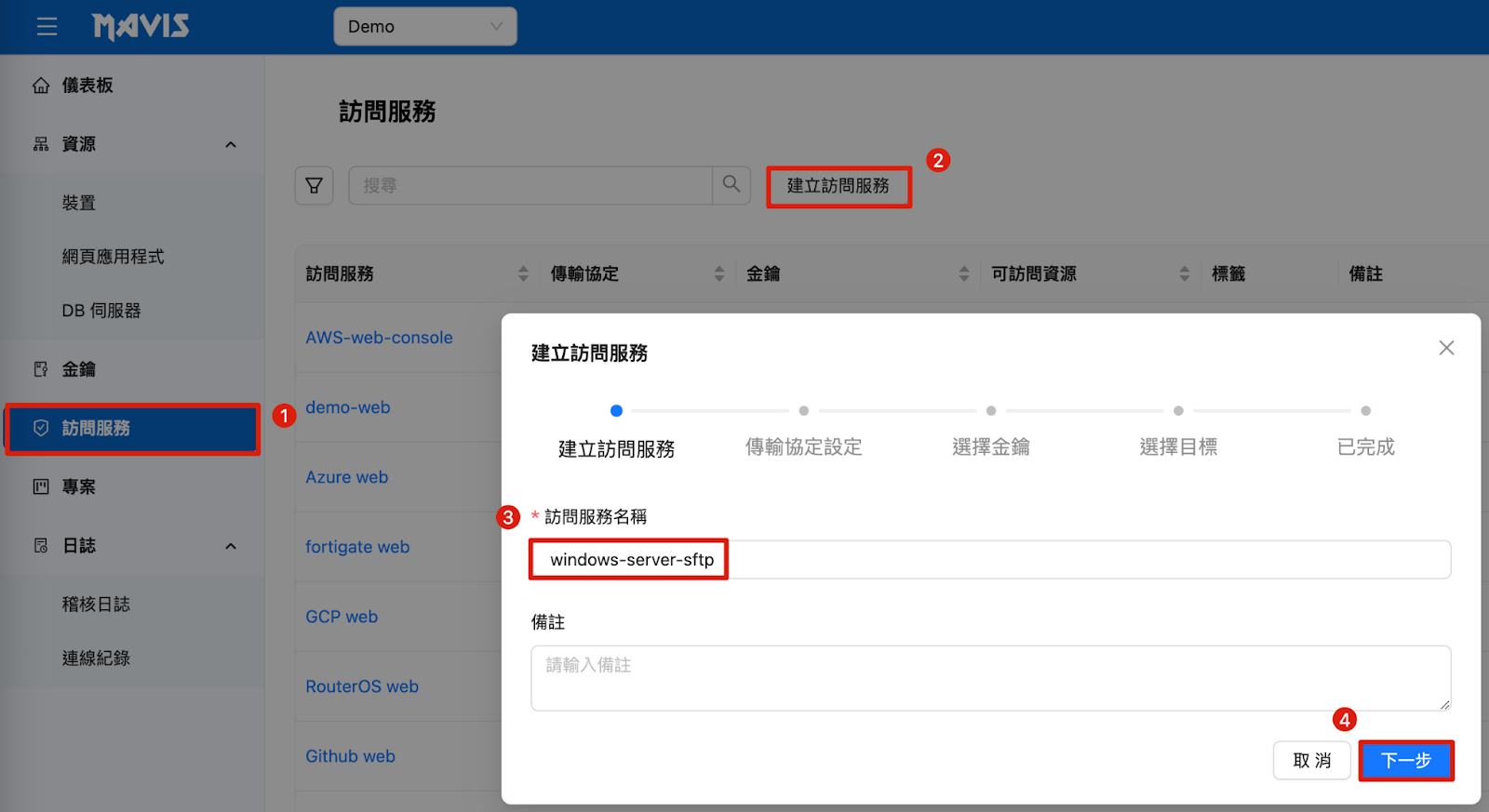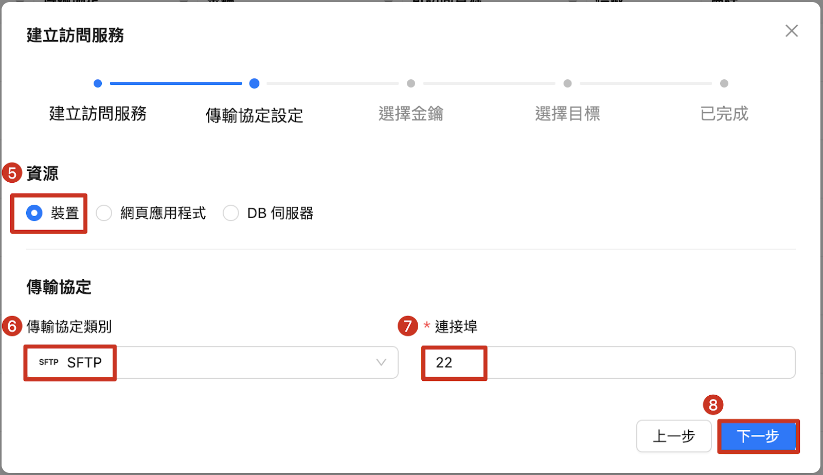 5. リソースとしてデバイスを選択 6. 転送プロトコルカテゴリ:SFTPを選択 7. SFTP接続ポートを入力 8. 次へ |