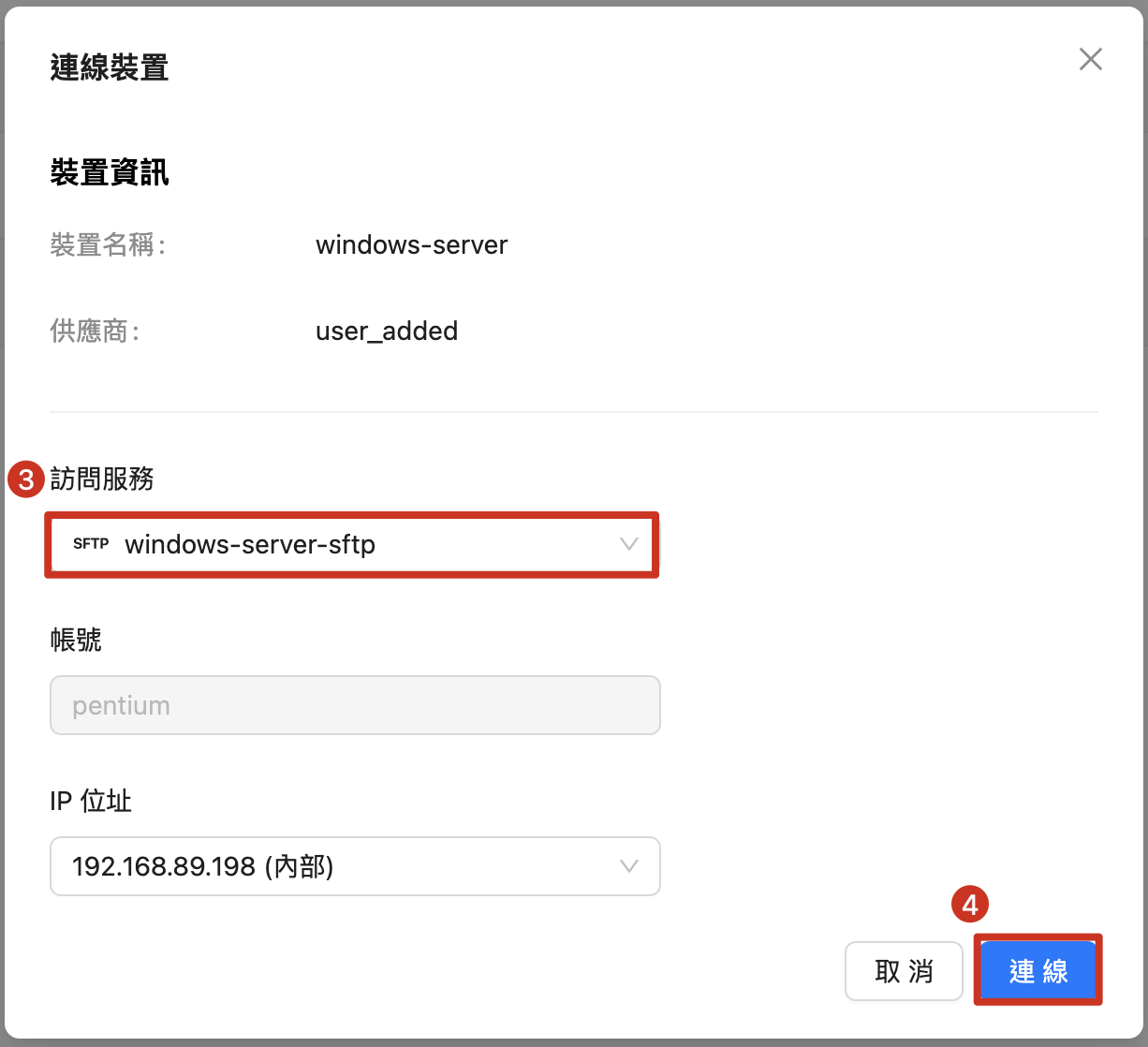 3. アクセスサービスで、バインドされているSFTPを選択します。 4. 接続をクリック |