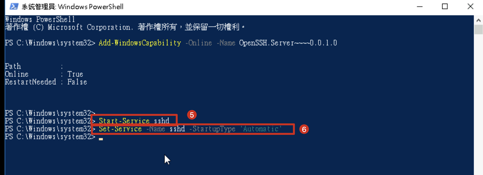 5. 以下のコマンドを実行してsshdサービスを開始します。 Start-Service sshd 6. 以下のコマンドを実行してsshdサービスを自動起動に設定します。 Set-Service -Name sshd -StartupType 'Automatic' |