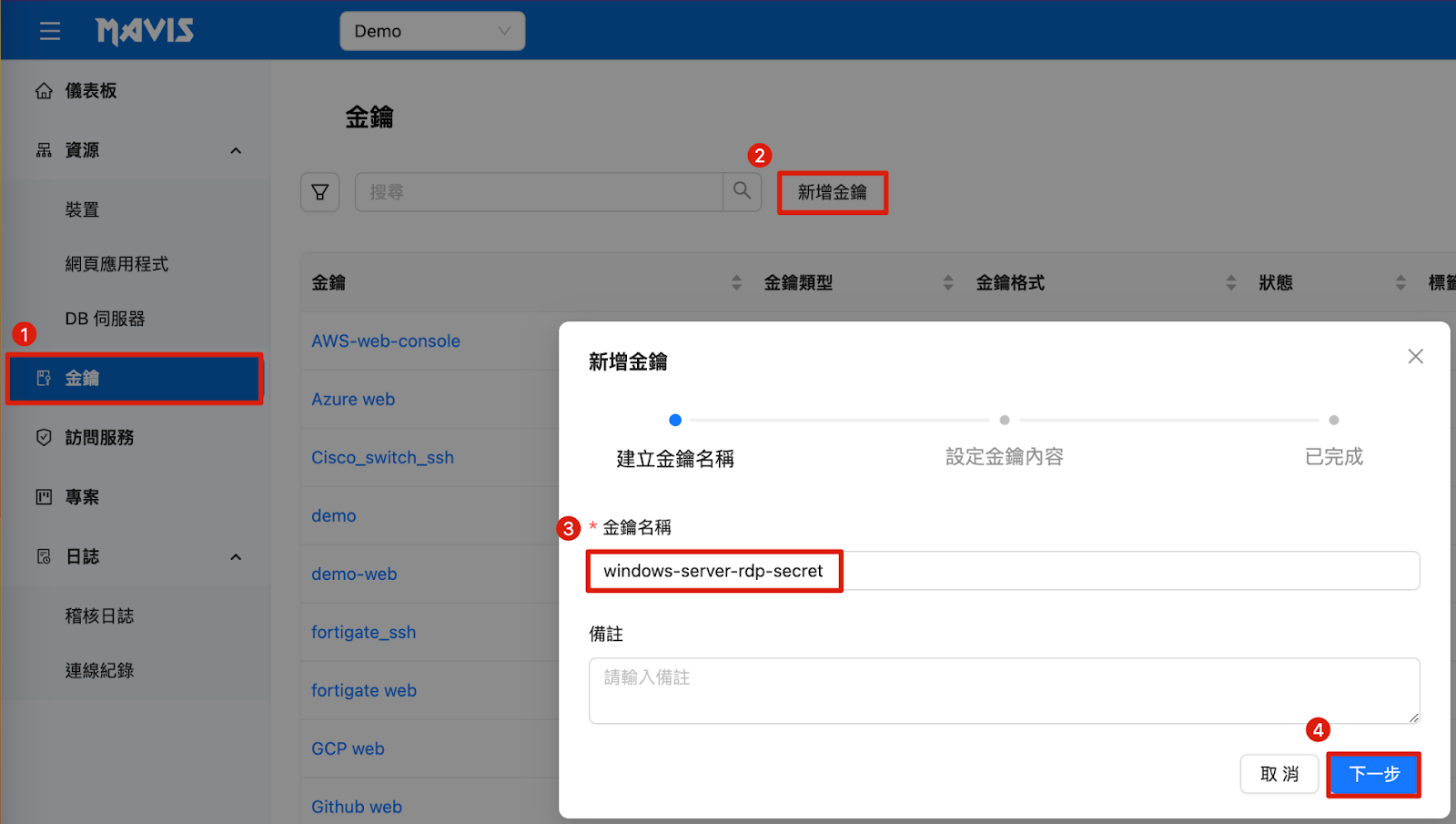 1. キーをクリック 2. 新規キーをクリック 3. カスタムキー名を入力 4. 次へ |