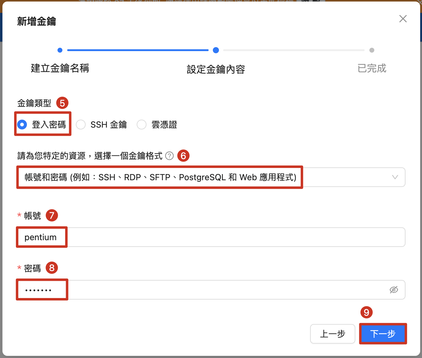 5. キーの種類を選択:デバイスのログイン方式に応じてパスワードまたはキーを選択。この例では、アカウントとパスワードを使用します。 6. バインドする資産のキー形式を選択:この例では、SFTPでアカウントとパスワードを使用します。 7. 輸SFTPアカウントを入力 8. 輸SFTPパスワードを入力 9. 次へ |