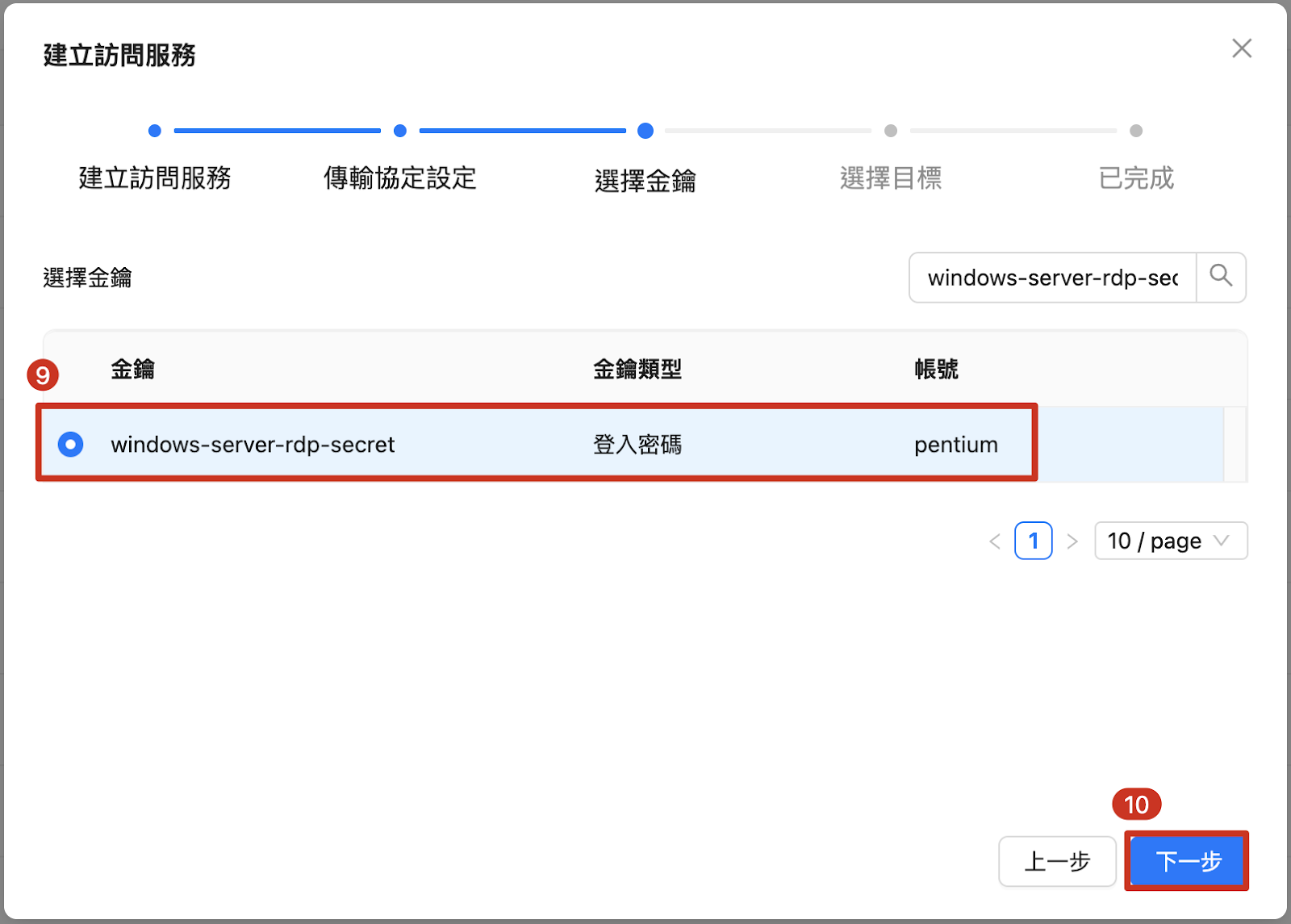 9. キーが作成済みの場合は、そのキーにチェックマークを付けます。 10. 次へ |