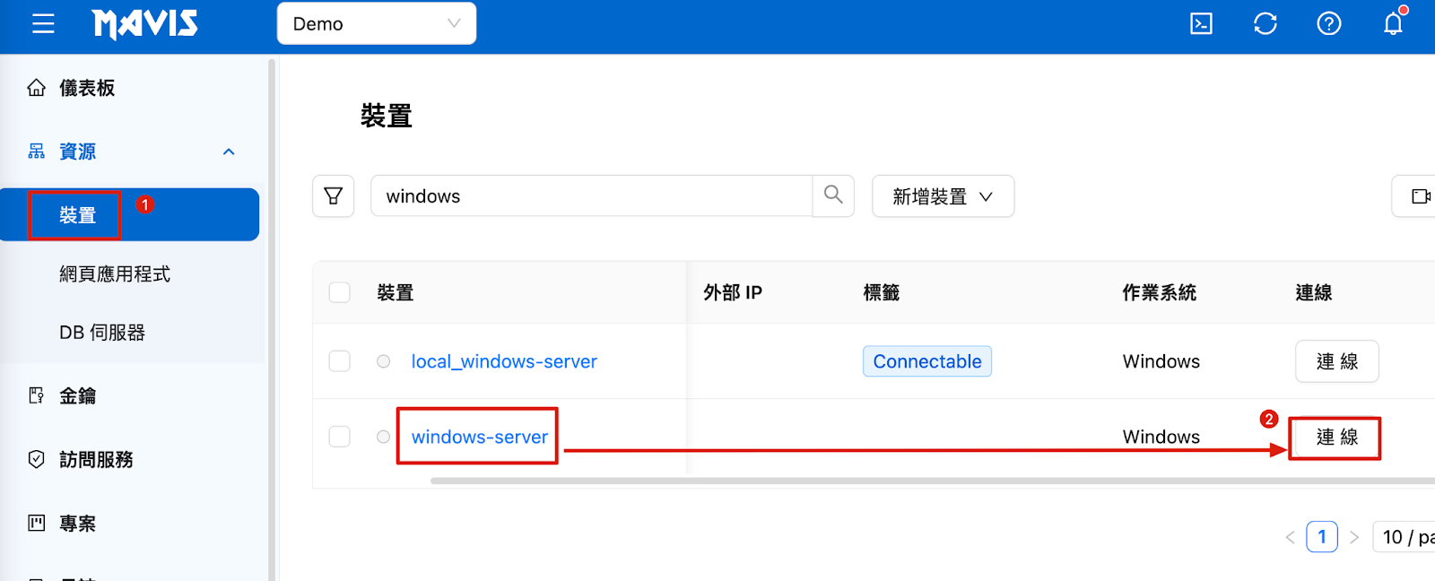 1. Windowsデバイスをクリック 2. デバイスに接続 > 接続を選択 |