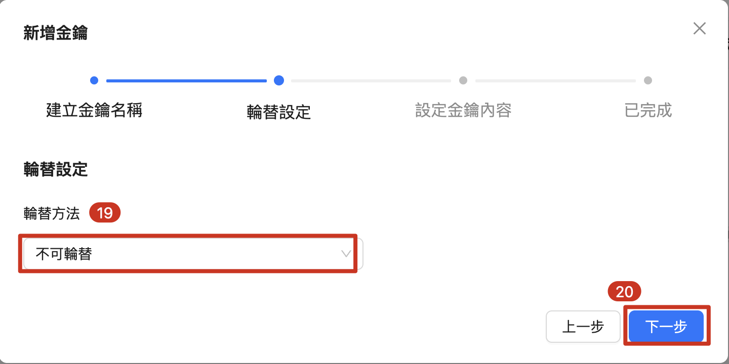 | 19. 輪替方式 預設「不可輪替」 20. 點擊 「下一步」 |