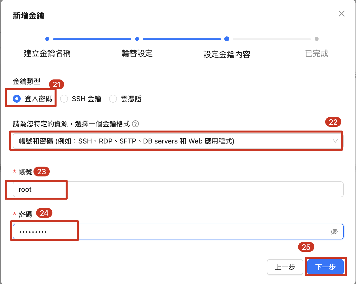 | 21. 勾選 登入密碼 或 SSH金鑰 ,這邊示範選擇密碼登入 22. 勾選金鑰格式 「帳號和密碼(例如):SSH、RDP、SFTP、PostgreSQL和Web」 23. 輸入登入帳號 24. 輸入登入密碼 25. 點擊 「下一步」 |