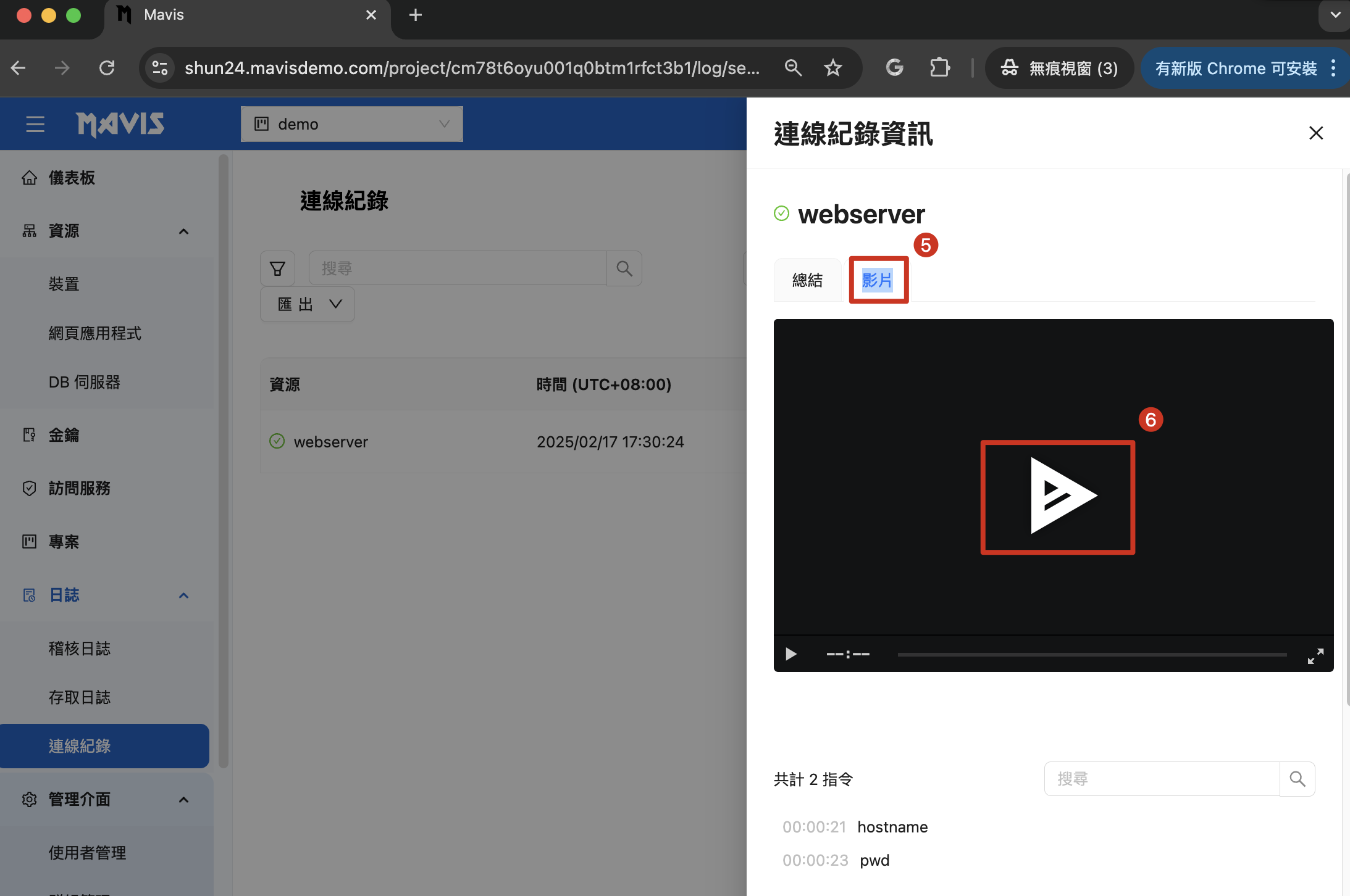 | 5 進入 影片 6 點擊「播放」 ,影片可清楚記錄使用者在伺服器上的所有操作行為! |