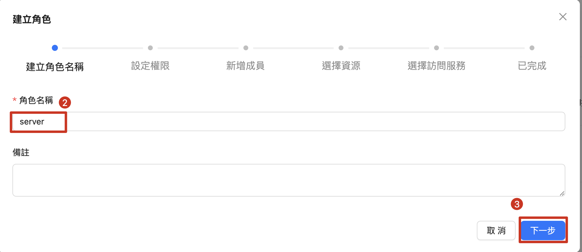 | 2. 角色名稱:輸入自定義名稱 3. 點擊 「下一步」 |