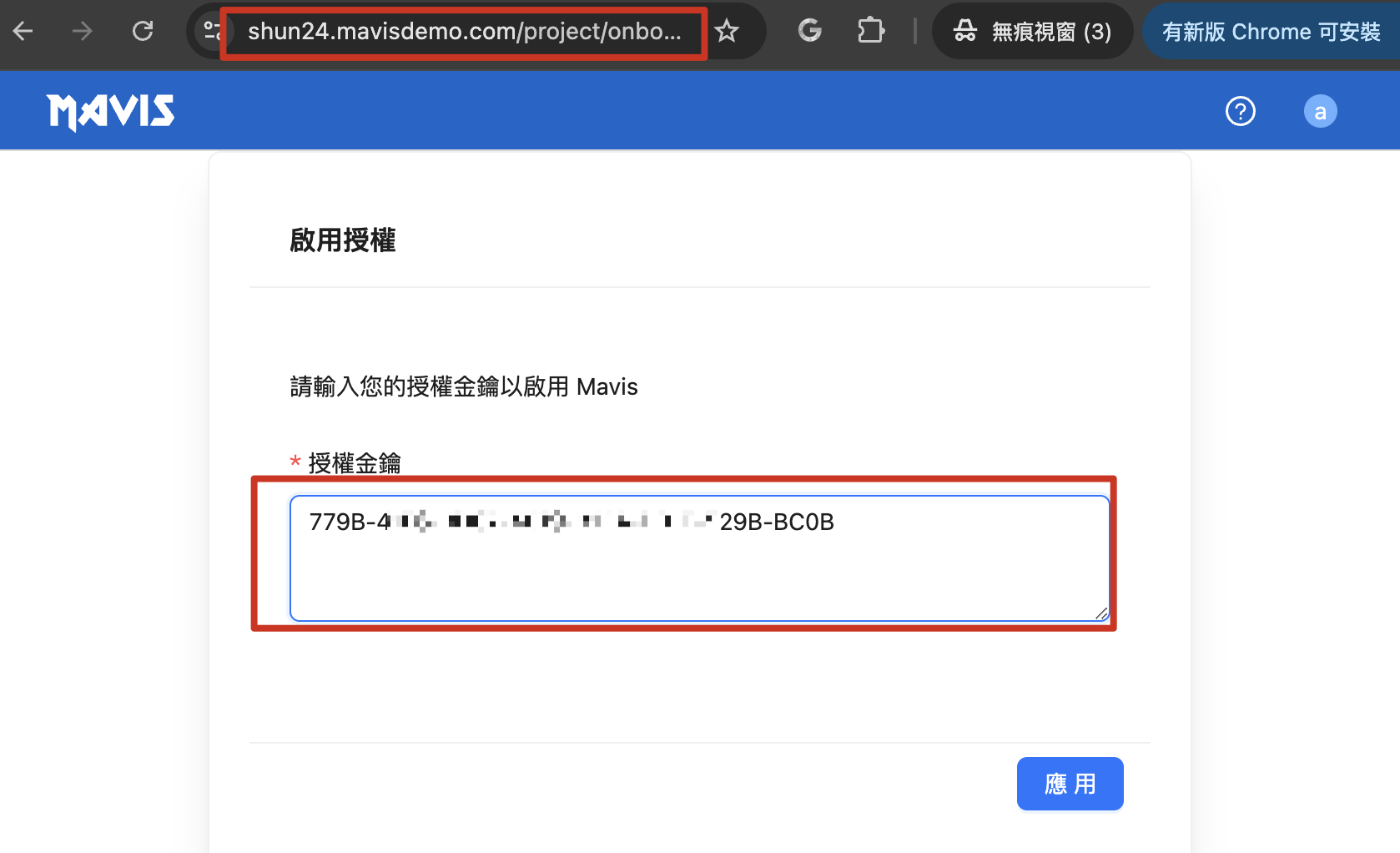 Mavis ライセンスを入力してください。有効化後、ログインが成功します。
