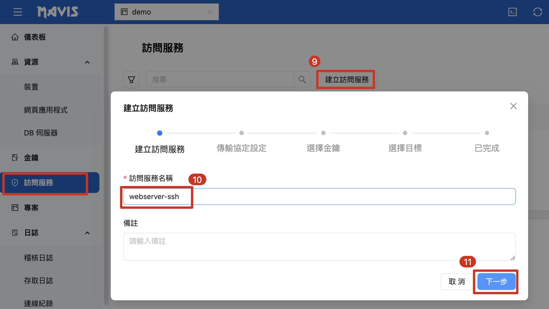 | 9. 連接到主選單「訪問服務」, 點擊 「建立訪問服務」 10. 輸入自定義訪問服務名稱 11 點擊 「下一步」 |