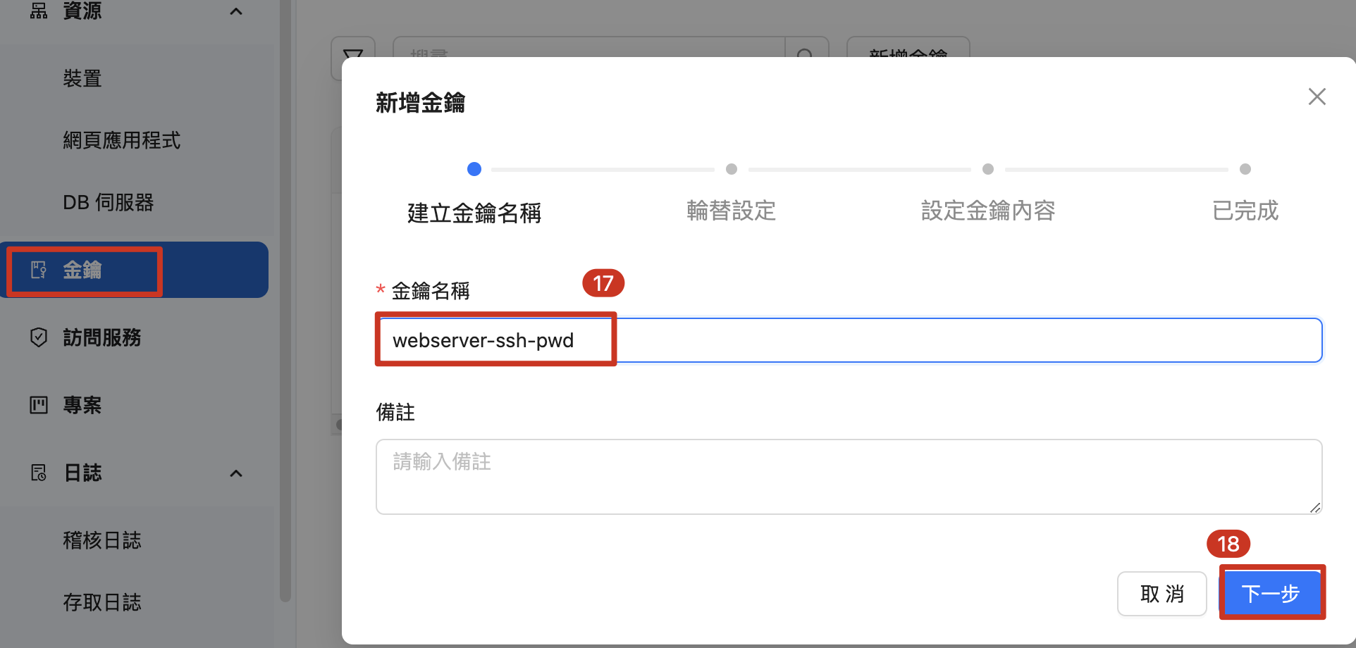 | 17. 連接到「新增金鑰」, 輸入 金鑰名稱 18. 點擊 「下一步」 |
