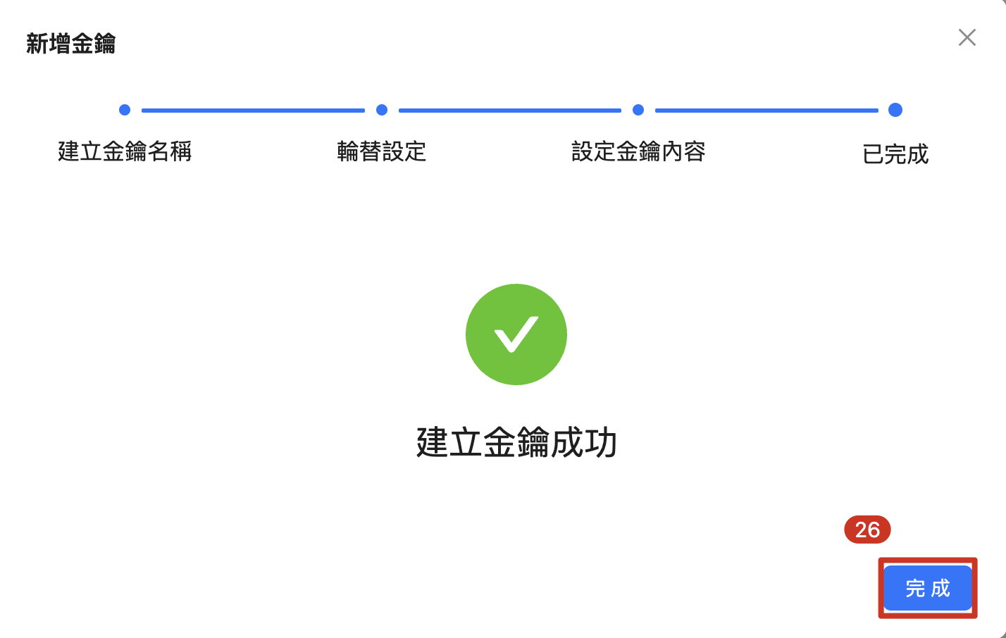 | 26. 金鑰成功建立, 點擊 「完成」 |